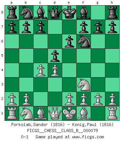 Last move : 0-1 2009 September 8 21:43:49 [Event "FICGS__CHESS__CLASS_B__000079"] [Site "FICGS"] [Date "2009.07.07"] [Round "1"] [White "Porkolab,Sandor"] [Black "Konig,Paul"] [Result "0-1"] [WhiteElo "1816"] [BlackElo "1816"] 1.d4 Nf6 2.Nf3 d5 3.c4 e6 0-1 This chess game has been lost on time (started : 2009.07.07 16:39:35) Queen's pawn game Player Black won this chess game. Follow this game move after move (download)The Pin is mightier than the sword. (Fred Reinfeld) Auf Remis zu spielen ist gewissermaßen ein Verbrechen gegen das Schachspiel. (Mikhail Nekhemyevich Tal) Solo puedes ser bueno en el Ajedrez si amas al juego. (Bobby Fischer) Il n'y a pas de prix trop élevé au scalp de l'ennemi. (Koblentz) When I took office, only high energy physicists had ever heard of what is called the World Wide Web... Now even my cat has its own page. (Bill Clinton, 1996)