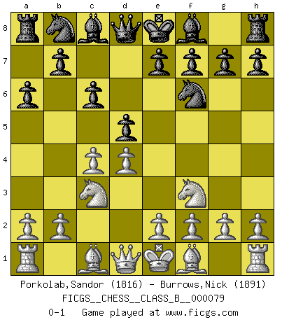 Last move : 0-1 2009 September 8 21:43:49 [Event "FICGS__CHESS__CLASS_B__000079"] [Site "FICGS"] [Date "2009.07.07"] [Round "1"] [White "Porkolab,Sandor"] [Black "Burrows,Nick"] [Result "0-1"] [WhiteElo "1816"] [BlackElo "1891"] 1.d4 d5 2.Nf3 Nf6 3.c4 c6 4.Nc3 a6 0-1 This chess game has been lost on time (started : 2009.07.07 16:39:35) Queen's pawn game Player Black won this chess game. Follow this game move after move (download)Do you realize Fischer almost never has any bad pieces? He exchanges them, and the bad pieces remain with his opponents. (Yuri Balashov) Die Elozahlen sind sehr schlecht für das Schach. Jetzt ist Schach eine Sportindustrie, die darauf zielt Elopunkte zu machen. (Miguel Najdorf) Nunca antes ha habido un jugador de Ajedrez con tal conocimiento a fondo de las complejidades del juego y una inmensa voluntad absolutamente indomable de ganar. Yo pienso que Fischer es el jugador mas grande que jamás haya existido. (Lisa Lane) Lorsque vous vous retrouvez devant une position atroce, ne tendez pas un ultime piège dérisoire avec l'intention d'abandonner si l'adversaire le déjoue ! Faites-vous plutôt un devoir de résister comme si votre vie en dépendait. Jouez le coup qui vous déplairait au centuple si vous étiez dans la peau de votre tortionnaire ! Luck never made a man wise. (Seneca, Letters to Lucilius)