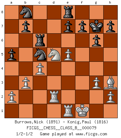 Last move : 1/2-1/2 2009 November 11 3:44:55 [Event "FICGS__CHESS__CLASS_B__000079"] [Site "FICGS"] [Date "2009.07.07"] [Round "1"] [White "Burrows,Nick"] [Black "Konig,Paul"] [Result "1/2-1/2"] [WhiteElo "1891"] [BlackElo "1816"] 1.c4 Nf6 2.Nc3 c5 3.Nf3 g6 4.g3 Nc6 5.Bg2 Bg7 6.d4 cxd4 7.Nxd4 Qb6 8.e3 O-O 9.O-O d6 10.b3 Bd7 11.Bb2 Rac8 12.Qd2 Rfe8 13.Rad1 a6 14.Nde2 Bf5 15.Nf4 Qa5 16.e4 Bg4 17.f3 Bd7 18.Na4 Qxd2 19.Rxd2 Nb8 20.Nb6 Rc6 21.Nxd7 Nfxd7 22.Bxg7 Kxg7 23.Nd5 Nc5 24.Rfd1 R6c8 25.Bh3 Rc6 26.Re1 Nbd7 27.f4 a5 28.e5 dxe5 29.fxe5 Nb8 30.Kf1 1/2-1/2 English Opening Kingside Castling by player Black (move 8) Kingside Castling by player White (move 9) This chess game ended in a draw. Follow this game move after move (download)Fischer is the strongest player in the world. In fact, the strongest player who ever lived. (Larry Evans) Wenn sie aufgeben, dann danke ich Ihnen für das Spiel (Eventualzug beim Fernschach). (Anonymous) El Ajedrez es tan interesante por sí solo, que no es necesario un interés monetario para persuadir a una persona a que lo practique; por lo tanto, nunca se juega por dinero. (Benjamin Franklin) Je fais ceci parce que dans cinquante coups j'obtiendrai cela; je m'appelle Mikhail Moisevitch Botvinnik. (Botvinnik) Happy endings are just stories that haven't finished yet. (Jane Smith in Mr & Mrs Smith)