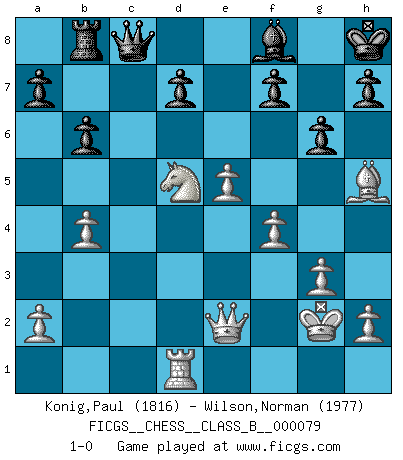 Last move : 1-0 2009 October 29 8:34:32 [Event "FICGS__CHESS__CLASS_B__000079"] [Site "FICGS"] [Date "2009.07.07"] [Round "1"] [White "Konig,Paul"] [Black "Wilson,Norman"] [Result "1-0"] [WhiteElo "1816"] [BlackElo "1977"] 1.c4 e6 2.Nc3 Bb4 3.Nf3 b6 4.g3 Bb7 5.Bg2 Nf6 6.Qb3 Nc6 7.O-O O-O 8.d3 Bc5 9.Rd1 Qb8 10.d4 Be7 11.d5 exd5 12.cxd5 Na5 13.Qc2 c5 14.dxc6 Bxc6 15.e4 Bc5 16.Bf4 Qe8 17.Nd4 Nh5 18.Nxc6 Nxc6 19.Bd6 Nd4 20.Rxd4 Bxd4 21.Rd1 Bc5 22.Bxf8 Bxf8 23.Qe2 g6 24.Nd5 Qe5 25.f4 Qd6 26.Bf3 Qc5+ 27.Kg2 Kh8 28.b4 Qc8 29.e5 Rb8 30.Bxh5 1-0 English Opening Kingside Castling by player White (move 7) Kingside Castling by player Black (move 7) Player White won this chess game. Follow this game move after move (download)I have never in my life played the French Defence, which is the dullest of all openings. (Wilhelm Steinitz) Das typische an einem Großmeister ist, daß er eine gewonnene Position schnell und schmerzlos gewinnt. (Irving Chernev) El Ajedrez era la lengua materna de Capablanca. (Reti) On entre au jeu d'Echecs comme on entre en Religion. Pour le joueur d'Echecs, la partie d'Echecs c'est l'office, la messe, le défilé du 1er Mai, le dépôt de gerbe au Monument aux Morts. C'est un drame sacré. (Michel Roos) After growing wildly for years, the field of computing appears to be reaching its infancy. (John Pierce)
