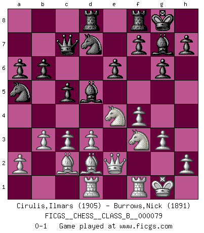 Last move : 0-1 2009 October 3 8:48:19 [Event "FICGS__CHESS__CLASS_B__000079"] [Site "FICGS"] [Date "2009.07.07"] [Round "1"] [White "Cirulis,Ilmars"] [Black "Burrows,Nick"] [Result "0-1"] [WhiteElo "1905"] [BlackElo "1891"] 1.f4 c5 2.Nf3 Nc6 3.e4 g6 4.Nc3 Bg7 5.Bc4 e6 6.O-O Nge7 7.e5 d5 8.exd6 Qxd6 9.Ne4 Qc7 10.c3 b6 11.d3 Bb7 12.Qe2 O-O 13.Bd2 Rad8 14.Rad1 Nd5 15.g3 Na5 16.Bb5 a6 17.Ba4 Nf6 18.Bc2 Bd5 19.b3 Nd7 0-1 This chess game has been lost on time (started : 2009.07.07 16:39:35) Bird's Opening Kingside Castling by player White (move 6) Kingside Castling by player Black (move 12) Player Black won this chess game. Follow this game move after move (download)Man is a frivolous, a specious creature, and like a Chess player, cares more for the process of attaining his goal than for the goal itself. (Dostoyevsky) Es ist wirklich schade, dass so viele Schachspieler nicht auf ihr Äußeres achten! (Alexandra Kosteniuk) ¿Quién es tu oponente esta tarde? Esta tarde mi oponente son las piezas negras. (Akiba Rubinstein) En blitz, le Cavalier l'emporte sur le Fou. (Vlastimil Hort) A good teacher is like a candle - it consumes itself to light the way for others. (Author unknown)