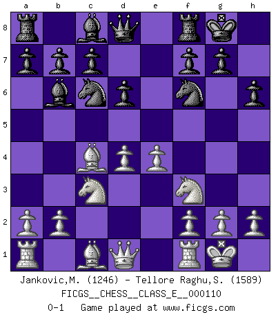 Last move : 0-1 2009 September 8 14:22:55 [Event "FICGS__CHESS__CLASS_E__000110"] [Site "FICGS"] [Date "2009.07.07"] [Round "1"] [White "Jankovic,Mladen"] [Black "Tellore Raghu,Shyam Sundar"] [Result "0-1"] [WhiteElo "1246"] [BlackElo "1589"] 1.e4 e5 2.Nf3 Nc6 3.Bc4 Bc5 4.d3 h6 5.O-O Nf6 6.c3 O-O 7.d4 exd4 8.cxd4 Bb6 9.Nc3 d6 0-1 Giuoco Pianissimo Kingside Castling by player White (move 5) Kingside Castling by player Black (move 6) Player Black won this chess game. Follow this game move after move (download)Openings teach you openings. Endgames teach you chess ! (Stephan Gerzadowicz) Schach ist die gewalttätigste aller Sportarten. (Garry Kasparov) Las combinaciones han sido siempre el aspecto más intrigante del Ajedrez. Los Maestros las buscan, el público las aplauden, los críticos las alaban. La razón se debe a que las combinaciones hacen posible que el Ajedrez sea más que un ejercicio matemático con una carencia de vida. Ellas son la poesía del juego, son del Ajedrez lo que la melodía es de la música. Ellas representan el triunfo de la mente sobre la materia. (Reuben Fine) Shah mat. Le roi est mort. Cri de fierté d'un joueur venant de terrasser son adversaire, courtoisement, sans effusion de sang. Perseverance does not equal worthiness. Next time you want to get my attention, wear something fun. Low-riding jeans are hot. (Gregory House, House M.D.)