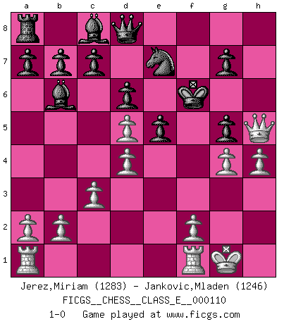 Last move : 1-0 2009 November 11 20:35:13 [Event "FICGS__CHESS__CLASS_E__000110"] [Site "FICGS"] [Date "2009.07.07"] [Round "1"] [White "Jerez,Miriam"] [Black "Jankovic,Mladen"] [Result "1-0"] [WhiteElo "1283"] [BlackElo "1246"] 1.e4 e5 2.Nf3 Nc6 3.Bc4 Nf6 4.Nc3 Bc5 5.d3 O-O 6.O-O d6 7.Ng5 Nd4 8.Bxf7+ Rxf7 9.Nxf7 Kxf7 10.Bg5 h6 11.Nd5 hxg5 12.c3 Nxd5 13.exd5 Nf5 14.Qh5+ Kf6 15.g4 Ne7 16.d4 Bb6 17.h4 1-0 This chess game has been lost on time (started : 2009.07.07 22:5:10) Two knights defense Kingside Castling by player Black (move 5) Kingside Castling by player White (move 6) Player White won this chess game. Follow this game move after move (download)Before the endgame, the Gods have placed the middle game. (Siegbert Tarrasch) Bobby Fischer ist kein Vorbild für die heutige Jugend. (Viktor Kortschnoi) El Ajedrez, como la música, como el amor, tiene el poder de hacer feliz a la gente. (Siegbert Tarrasch) Tout change constamment, y compris dans le monde des Echecs. (Botvinnik) I can't decide which is riskier; taking crazy risks, or taking advice on crazy risks from a crazy risk taker. (Gregory House in House M.D.)
