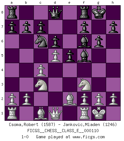 Last move : 1-0 2009 September 22 22:26:54 [Event "FICGS__CHESS__CLASS_E__000110"] [Site "FICGS"] [Date "2009.07.07"] [Round "1"] [White "Csoma,Robert"] [Black "Jankovic,Mladen"] [Result "1-0"] [WhiteElo "1587"] [BlackElo "1246"] 1.d4 Nf6 2.c4 g6 3.Nc3 Bg7 4.e4 O-O 5.e5 d6 6.exf6 Bxf6 7.Nf3 Nc6 8.Be2 Bf5 9.O-O e5 10.d5 1-0 This chess game has been lost on time (started : 2009.07.07 22:5:10) King's Indian : 4.e4 Kingside Castling by player Black (move 4) Kingside Castling by player White (move 9) Player White won this chess game. Follow this game move after move (download)At this time Fischer is simply a level above all the best Chessplayers in the world. (John Jacobs) Vom Schach wurde gesagt das Leben sei dafür nicht lange genug. Aber das ist der Fehler des Lebens, nicht des Schach'. (Irving Chernev) Alekhine es un poeta que crea un trabajo de arte de algo que raramente inspiraría a otra persona a mandar una tarjeta postal. (Max Euwe) Il s'avisa de me proposer d'apprendre les échecs qu'il jouait un peu... me voilà forcené des échecs. J'achète un échiquier, je m'enferme dans ma chambre, j'y passe des jours et des nuits à vouloir apprendre par cur toutes les parties. (Jean-Jacques Rousseau, Confessions) The meaning of life is that it is to be lived, and it is not to be traded and conceptualized and squeezed into a pattern of systems. (Bruce Lee)