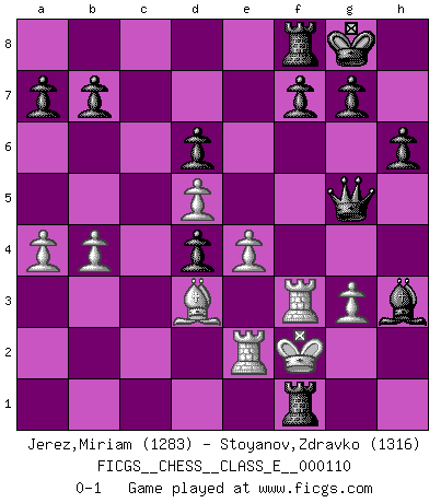 Last move : 0-1 2009 September 1 15:38:36 [Event "FICGS__CHESS__CLASS_E__000110"] [Site "FICGS"] [Date "2009.07.07"] [Round "1"] [White "Jerez,Miriam"] [Black "Stoyanov,Zdravko"] [Result "0-1"] [WhiteElo "1283"] [BlackElo "1316"] 1.e4 c5 2.c4 Nc6 3.Nc3 e6 4.Nf3 Bd6 5.d4 Qa5 6.Bd2 cxd4 7.Nd5 Qd8 8.Bd3 exd5 9.cxd5 Ne5 10.Nxe5 Bxe5 11.O-O h6 12.h3 Nf6 13.Qh5 Nxh5 14.Rae1 O-O 15.b3 d6 16.a4 Nf4 17.Bxf4 Bxf4 18.b4 Qg5 19.g3 Bxg3 20.fxg3 Bxh3 21.Rf3 Rac8 22.Re2 Rc1+ 23.Kf2 Rf1+ 0-1 Sicilian defense Kingside Castling by player White (move 11) Kingside Castling by player Black (move 14) Player Black won this chess game. Follow this game move after move (download)Look at Garry Kasparov. After he loses, invariably he wins the next game. He just kills the next guy. That's something that we have to learn to be able to do. (Maurice Ashley) Schach ist ein Kampf gegen den Fehler. (Johannes Herrman Zukertort) Un juego de Ajedrez es un dialogo, una conversación entre un jugador y su oponente. Cada movimiento del oponente puede contener amenazas o tropiezos, pero un jugador no se puede defender de las amenazas o tomar ventaja de los tropiezos si es que no se pregunta a sí mismo: ¿Que es lo que mi oponente va a hacer después de cada movida?. (Bruce A. Moon) Il (Jacob Murray) ne joue pas pour le bon coup, mais pour le meilleur. (Eloi Relange) Locking firmely the window serves nothing, only small thiefs pass through there, the big thiefs enter through the front door. (Luc-Olivier Leclerc)