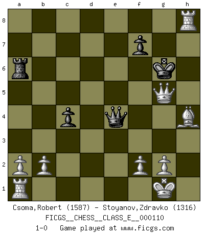 Last move : 1-0 2009 December 17 21:43:54 [Event "FICGS__CHESS__CLASS_E__000110"] [Site "FICGS"] [Date "2009.07.07"] [Round "1"] [White "Csoma,Robert"] [Black "Stoyanov,Zdravko"] [Result "1-0"] [WhiteElo "1587"] [BlackElo "1316"] 1.d4 d6 2.c4 e6 3.e4 Be7 4.Nc3 h6 5.Nf3 Nf6 6.Bd3 O-O 7.O-O a6 8.e5 dxe5 9.dxe5 Nfd7 10.Qe2 Re8 11.Rd1 Kf8 12.Be3 c5 13.Ne4 Nc6 14.Nd6 Bxd6 15.exd6 b6 16.Be4 Ndb8 17.h3 Qd7 18.Ne1 Bb7 19.Nd3 Na5 20.Bxb7 Nxb7 21.Ne5 Qd8 22.d7 Re7 23.Qf3 b5 24.cxb5 Nxd7 25.Nc6 Qb6 26.Nxe7 Kxe7 27.bxa6 Rxa6 28.Qe2 Qc6 29.Qg4 g5 30.h4 Nf6 31.Qf3 Qb5 32.hxg5 hxg5 33.Bxg5 e5 34.Qf5 c4 35.Re1 Kf8 36.Bxf6 Nd6 37.Qxe5 Qc6 38.Qe7+ Kg8 39.Qd8+ Ne8 40.Rxe8+ Kh7 41.Rh8+ Kg6 42.Bh4 Qe4 43.Qg5+ 1-0 Old Indian defense Kingside Castling by player Black (move 6) Kingside Castling by player White (move 7) Player White won this chess game. Follow this game move after move (download)In life, as in Chess, one's own Pawns block one's way. A man's very wealth, ease, leisure, children, books, which should help him to win, more often checkmate him. (Charles Buxton) Zum Sieg gelangt man nicht, wenn man gut, sondern nur wenn man besser spielt (Savielly Grigorievitsch Tartakower) En partidas rápidas, el Caballo es mas poderoso que el Alfil. (Vlastimil Hort) La vérité est comme le meilleur coup aux échecs : elle existe, mais il faut la chercher. (Arturo Perez-Reverte) If you know the enemy and know yourself you need not fear the results of a hundred battles. (Sun Tzu)