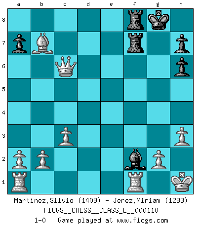 Last move : 1-0 2009 August 29 4:26:38 [Event "FICGS__CHESS__CLASS_E__000110"] [Site "FICGS"] [Date "2009.07.07"] [Round "1"] [White "Martinez,Silvio"] [Black "Jerez,Miriam"] [Result "1-0"] [WhiteElo "1409"] [BlackElo "1283"] 1.e4 e5 2.Nf3 Nc6 3.Bc4 Nh6 4.Nc3 Bc5 5.d4 exd4 6.Nb5 O-O 7.Nbxd4 Nxd4 8.Nxd4 c6 9.Bxh6 gxh6 10.O-O d6 11.c3 d5 12.exd5 cxd5 13.Bb3 Be6 14.Nxe6 fxe6 15.h3 Qf6 16.Kh1 Bxf2 17.Qe2 Qh4 18.Qxe6+ Rf7 19.Bxd5 Raf8 20.Bxb7 Kh8 21.Qe5+ Qf6 22.Qxf6+ Kg8 23.Qc6 1-0 King's pawn game Kingside Castling by player Black (move 6) Kingside Castling by player White (move 10) Player White won this chess game. Follow this game move after move (download)Chess is like life. (Boris Spassky) Wie, soll nun auch die Opposition abgeschafft werden? Ja, es tut mir leid, Ihnen diesen Schmerz nicht ersparen zu können. (Aaron Nimzowitsch) Me siento como si fuera una pieza en una partida de Ajedrez, cuando mi oponente me indica: esa pieza no puede ser movida. (Soren Kierkegaard) A chaque perte on perd un peu de soi. (Joël Lautier) Don't anthropomorphize computers - they hate it. (Anonymous)