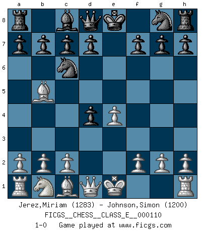 Last move : 1-0 2009 September 11 22:1:5 [Event "FICGS__CHESS__CLASS_E__000110"] [Site "FICGS"] [Date "2009.07.07"] [Round "1"] [White "Jerez,Miriam"] [Black "Johnson,Simon"] [Result "1-0"] [WhiteElo "1283"] [BlackElo "1200"] 1.e4 e5 2.Nf3 Nc6 3.Bc4 Bc5 4.d4 Bxd4 5.Nxd4 exd4 6.Bb5 1-0 This chess game has been lost on time (started : 2009.07.07 22:5:10) Giuoco Piano Player White won this chess game. Follow this game move after move (download)You can only get good at Chess if you love the game. (Bobby Fischer) Schach ist eine Sache der genauen Beurteilung, wann man zuschlagen und wann man sich ducken muss. (Robert James Fischer) Fischer no está bajo la obligación de nadie. (Joseph Platz) Aux échecs, l'amour-propre est satisfait quand on remporte la victoire, mais il n'y a pas de honte à être battu. (Benjamin Franklin) The age of a woman doesn't mean a thing. The best tunes are played on the oldest fiddles. (Ralph Waldo Emerson)