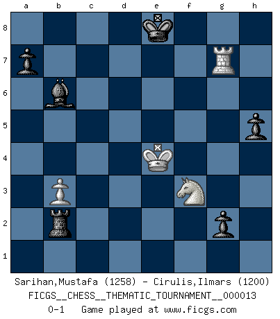 Last move : 0-1 2007 December 10 20:36:41 [Event "FICGS__CHESS__THEMATIC_TOURNAMENT__000013"] [Site "FICGS"] [Date "2006.09.19"] [Round "1"] [White "Sarihan,Mustafa"] [Black "Cirulis,Ilmars"] [Result "0-1"] [WhiteElo "1258"] [BlackElo "1200"] 1.g4 d5 2.e3 Nc6 3.d4 e5 4.Bb5 exd4 5.exd4 Qe7+ 6.Qe2 Bxg4 7.Bxc6+ bxc6 8.Qxe7+ Bxe7 9.Ne2 Nf6 10.Bf4 Rb8 11.b3 Kd7 12.Nd2 Rhe8 13.h3 Bxe2 14.Kxe2 c5 15.Kd3 cxd4 16.Be5 Rb6 17.Bxd4 c5 18.Bxf6 Rxf6 19.c4 dxc4+ 20.Nxc4 Rxf2 21.Raf1 Rxf1 22.Rxf1 f6 23.Ke4 Ke6 24.Re1 Rd8 25.Kf3 Kf7 26.h4 g6 27.Re2 Rd3+ 28.Kg2 Rd4 29.Na5 Rxh4 30.Nc6 Bd6 31.Nd8+ Kf8 32.Re6 Rh2+ 33.Kf3 Bc7 34.Nc6 Rxa2 35.Rxf6+ Ke8 36.Ke4 g5 37.Rf5 g4 38.Rxc5 g3 39.Rg5 Rf2 40.Nd4 g2 41.Ke3 Rb2 42.Ke4 Bd8 43.Rg7 h5 44.Nf3 Bb6 0-1 This chess game has been lost on time (started : 2006.09.19 14:14:39) Grob's attack 10 pieces endgame at move 38 : White KRNP , Black KRBPPP WHITE : King + 1 Rook 1 Knight 1 Pawn BLACK : King + 1 Rook 1 Bishop 3 Pawns Player Black won this chess game. Follow this game move after move (download)Man is a frivolous, a specious creature, and like a Chess player, cares more for the process of attaining his goal than for the goal itself. (Dostoyevsky) Wenn Dein Gegner dir ein Remis anbietet, versuch herauszufinden, weshalb er glaubt schlechter zu stehen. (Nigel Short) Tu eres para mi la Reina en d8 y yo soy el Peón en d7!!. (GM Eduard Gufeld) Le joueur d'Echecs qui veut atteindre le top est obligé de développer son propre credo créatif. Alexeï Stepanovicth Souétine. Il est facile d'écrire des livres ! Ce qui est difficile, c'est de jouer ! (Alexeï Stepanovicth Souétine) I live to kill Traxler counterattack. (Ilmars Cirulis)