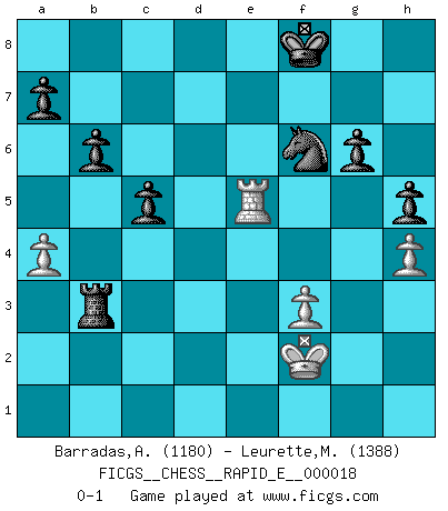 Last move : 0-1 2009 July 16 14:41:49 [Event "FICGS__CHESS__RAPID_E__000018"] [Site "FICGS"] [Date "2009.07.08"] [Round "1"] [White "Barradas,Anderson"] [Black "Leurette,Marc-Antoine"] [Result "0-1"] [WhiteElo "1180"] [BlackElo "1388"] 1.e4 e5 2.Nf3 Nc6 3.Bb5 Nf6 4.O-O Nxe4 5.d3 Nd6 6.Bxc6 dxc6 7.Re1 Be7 8.Rxe5 O-O 9.Re1 b6 10.Nc3 c5 11.Nd5 Be6 12.Nxe7+ Qxe7 13.Bf4 Qf6 14.c3 Qxf4 15.Qc1 Qf5 16.d4 cxd4 17.cxd4 Bd5 18.Re3 Rae8 19.b3 Rxe3 20.Qxe3 Bxf3 21.Qxf3 Qxf3 22.gxf3 c6 23.Rc1 Nb5 24.Rc4 Rc8 25.d5 c5 26.a4 Nd6 27.Rc1 Nf5 28.Kg2 Rd8 29.Re1 Kf8 30.Re5 Ne7 31.f4 Nxd5 32.Kg3 Nf6 33.f3 h5 34.h4 g6 35.f5 Rd3 36.fxg6 fxg6 37.Kf2 Rxb3 0-1 Ruy Lopez : Berlin defense, Open variation Kingside Castling by player White (move 4) Kingside Castling by player Black (move 8) Player Black won this chess game. Follow this game move after move (download)Adequate compensation for a sacrifice is having a sound combination leading to a winning position; adequate compensation for a blunder is having your opponent snatch defeat from the jaws of victory. (Bruce A. Moon) Irgendwie scheint mir sonntags früh um 9 Uhr der Killerinstinkt verloren gegangen zu sein. (Alexej Shirov) El Ajedrez es un invernadero donde los frutos del carácter pueden madurar mas completamente que en la vida. (Edward Morgan Foster) Les pièces de l'échiquier étaient impitoyables. Elles le retenaient, elles l'absorbaient. Il y avait de l'horreur en cela, mais aussi une harmonie unique. Car, qu'y a-t-il dans le monde, à part les échecs ? (V. Nabokov) Kids, you tried your best and you failed miserably. The lesson is, never try. (Simpsons)
