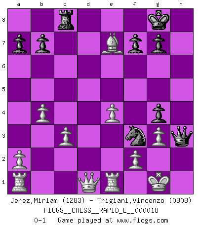 Last move : 0-1 2009 September 16 2:4:34 [Event "FICGS__CHESS__RAPID_E__000018"] [Site "FICGS"] [Date "2009.07.08"] [Round "1"] [White "Jerez,Miriam"] [Black "Trigiani,Vincenzo"] [Result "0-1"] [WhiteElo "1283"] [BlackElo "0808"] 1.e4 e5 2.Nf3 Nf6 3.Nc3 Bc5 4.Bc4 Ng4 5.d4 exd4 6.Nxd4 Nc6 7.O-O O-O 8.Nce2 Nxd4 9.Nxd4 d6 10.c3 Qh4 11.g3 Qh3 12.Bg5 Nxh2 13.Re1 h6 14.Be3 Bg4 15.Be2 h5 16.Bxg4 hxg4 17.b4 Bb6 18.Nf5 Rae8 19.Bxb6 Re5 20.Bxc7 Rc8 21.Bxd6 Re6 22.Ne7+ Rxe7 23.Bxe7 Nf3+ 0-1 Petrov Three knights game Kingside Castling by player White (move 7) Kingside Castling by player Black (move 7) Player Black won this chess game. Follow this game move after move (download)Up to this point White has been following well-known analysis. But now he makes a fatal error: he begins to use his own head. (Siegbert Tarrasch) Das Schachspiel hat wie die Liebe, die Musik, die Fähigkeit, den Menschen glücklich zu machen. Ich habe ein leises Gefühl des Bedauerns für jeden, der das Schachspiel nicht kennt, so wie ich jeden bedaure, der die Liebe nicht kennt. (Siegbert Tarrasch) El Ajedrez es tan inspirador que yo no creo que un buen jugador sea capaz de tener un pensamiento malo durante una partida. (Wilhelm Steinitz) Toutes choses étant égales, c'est la conviction qui gagne. Alliée à une volonté de vaincre, elle sert de détonateur, suscite des idées, disperse les doutes et aide à penser clairement. (Robert Fischer) Nowadays, anyone who cannot speak English and is incapable of using the Internet is regarded as backward. (Al-Waleed bin Talal)