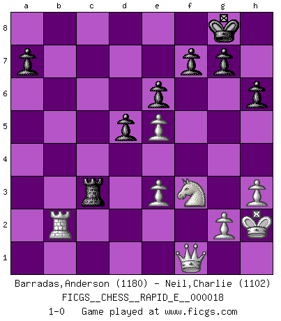 Last move : 1-0 2009 July 22 15:14:10 [Event "FICGS__CHESS__RAPID_E__000018"] [Site "FICGS"] [Date "2009.07.08"] [Round "1"] [White "Barradas,Anderson"] [Black "Neil,Charlie"] [Result "1-0"] [WhiteElo "1180"] [BlackElo "1102"] 1.e4 e6 2.d4 d5 3.e5 c5 4.c3 Nc6 5.Bb5 Bd7 6.Nf3 Nge7 7.Bg5 cxd4 8.cxd4 Qa5+ 9.Nc3 Nf5 10.O-O Bb4 11.Bxc6 bxc6 12.Qd3 Bc8 13.Rfc1 c5 14.a3 Ba6 15.Qd2 Bxc3 16.bxc3 O-O 17.dxc5 Qxc5 18.h3 h6 19.Be3 Nxe3 20.fxe3 Rfc8 21.a4 Bc4 22.a5 Rab8 23.Ra4 Rb5 24.Nd4 Rxa5 25.Rxa5 Qxa5 26.Rb1 Qa2 27.Rb2 Qa1+ 28.Kh2 Qf1 29.Nf3 Be2 30.Qxe2 Rxc3 31.Qxf1 1-0 French : Advance variation Kingside Castling by player White (move 10) Kingside Castling by player Black (move 16) Player White won this chess game. Follow this game move after move (download)You are for me the Queen on d8 and I am the Pawn on d7 !! (Eduard Gufeld) Es hat in meinem Leben Zeiten gegeben, in denen das Schachspiel, wenn nicht zum Lebenszweck, so doch zu einem regelrechten Lebensersatz geworden ist. Man fühlt sich in solchen Zeiten nicht so, als besäße man eine göttliche Gabe, sondern eher so, als sei man von ihr besessen. (Garry Kasparov) EL Ajedrez es como la vida. (Boris Spassky) Un millionnaire : 'Monsieur Steinitz ! Vous ne participez aux tournois que pour l'argent, alors que moi je n'y viens que pour l'honneur.' Steinitz : 'Chacun joue pour ce qu'il n'a pas'... If you work for a living, why do you kill yourself working ? (Tuco to a chicken in The Good, The Bad and The Ugly)