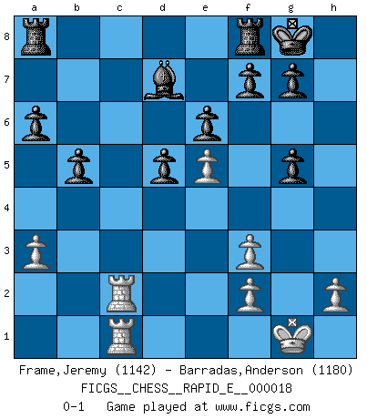 Last move : 0-1 2009 August 1 13:25:9 [Event "FICGS__CHESS__RAPID_E__000018"] [Site "FICGS"] [Date "2009.07.08"] [Round "1"] [White "Frame,Jeremy"] [Black "Barradas,Anderson"] [Result "0-1"] [WhiteElo "1142"] [BlackElo "1180"] 1.e4 c5 2.Nf3 e6 3.c3 d5 4.e5 a6 5.d4 cxd4 6.cxd4 Nc6 7.Nc3 Bb4 8.Bd2 Nge7 9.a3 Bxc3 10.Bxc3 Ng6 11.Bd3 Nf4 12.O-O O-O 13.Rc1 Bd7 14.Bd2 Nxd3 15.Bg5 Nxb2 16.Qc2 Qb6 17.Rb1 Nxd4 18.Qxb2 Qxb2 19.Rxb2 Nxf3+ 20.gxf3 b5 21.Rc2 h6 22.Rfc1 hxg5 0-1 Sicilian defense Kingside Castling by player White (move 12) Kingside Castling by player Black (move 12) Player Black won this chess game. Follow this game move after move (download)Chess is 99 percent tactics. (Teichmann) Dieses schreckliche Gefühl, dass ich gegen eine Maschine spielte, die niemals Fehler macht, zerschmetterte meinen Widerstand. (Mark Taimanov) No solamente yo pronostico su triunfo sobre Botvinnik, sino que me adelanto y digo que probablemente Fischer es el jugador de Ajedrez mas grande que haya existido. (John Collins) On croit qu'il y a plus de mauvais joueurs que de bons joueurs, c'est faux : Il y a autant de joueurs qui gagnent que de joueurs qui perdent. (Philippe Geluck) The quality of decision is like the well-timed swoop of a falcon which enables it to strike and destroy its victim. (Sun Tzu)