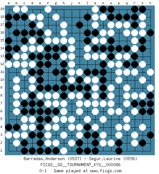 Last move : 0-1 2009 October 14 22:16:32 [Event "FICGS__GO__TOURNAMENT_KYU__000086"] [Site "FICGS"] [Date "2009.07.08"] [Round "1"] [Black "Barradas,Anderson"] [White "Segur,Laurine"] [Result "0-1"] [Rating 1 "0537"] [Rating 2 "0596"] 1.e6 d15 2.p14 q16 3.l16 h17 4.g14 e17 5.e16 f15 6.g16 g15 7.e15 f16 8.g17 h16 9.f17 g18 10.f18 e18 11.d17 f19 12.f14 e14 13.d16 d14 14.c15 d18 15.c18 c17 16.c16 b17 17.b18 b19 18.a17 c19 19.b16 c14 20.b14 a14 21.a15 b13 22.a13 a12 23.a14 b12 24.a18 c13 25.f13 b10 26.e13 d12 27.d13 c11 28.e12 q5 29.p5 q4 30.d11 c12 31.e11 b8 32.c10 b9 33.c9 c8 34.d8 c5 35.c7 b7 36.c6 b6 37.d6 d9 38.e9 d10 39.e10 e8 40.d7 f7 41.f6 g8 42.f9 g7 43.g9 h6 44.g6 h7 45.h9 g4 46.h5 g5 47.f5 f4 48.e4 d4 49.e3 d5 50.e5 j5 51.h4 h3 52.j4 k4 53.j3 j2 54.d3 c3 55.c2 f2 56.e2 e1 57.d1 b3 58.f1 g2 59.g1 b2 60.c1 h1 61.e1 f3 62.j6 k3 63.j7 n16 64.h8 f8 65.k5 m15 66.k2 q9 67.q10 p12 68.q12 q13 69.q14 q11 70.r12 p13 71.r13 p10 72.r10 r11 73.s11 p11 74.s14 s10 75.r9 s12 76.p9 q8 77.p8 r8 78.s9 t11 79.o13 o12 80.n12 n13 81.o14 t9 82.n14 m13 83.m14 l14 84.l15 l13 85.n11 m10 86.n10 o9 87.n9 o8 88.p7 p6 89.q6 o6 90.r7 o7 91.t8 s8 92.t7 j14 93.t6 r6 94.s6 q7 95.s7 s4 96.t3 r3 97.s2 r2 98.o5 n5 99.o4 m6 100.n4 m4 101.m3 n3 102.o3 n2 103.m2 o2 104.p2 p3 105.k1 h15 106.h14 j15 107.m16 n15 108.o15 o16 109.n17 o17 110.o18 p17 111.p18 q17 112.q18 r15 113.s15 s16 114.t16 r14 115.r17 s17 116.r18 s18 117.r19 r16 118.s19 m18 119.k17 m17 120.l18 n18 121.n19 m19 122.o19 m8 123.l4 p4 124.l3 j4 125.l1 l5 126.m1 k6 127.e7 h5 128.p1 j11 129.h11 j12 130.h12 j10 131.h10 g12 132.g11 h13 133.f12 j13 134.g13 j8 135.j9 k7 136.k9 m9 137.l9 k8 138.l8 l7 139.n8 n7 140.m11 l10 141.k10 k11 142.l11 m7 143.b4 c4 144.a4 a3 0-1 Here are the names of the openings (joseki) played in the four corners : Corner q16 : p14 q16 This joseki is unknown. A weak or weird move has probably been played in this corner. Corner q4 : q5 p5 Takamoku (Gomok, Gaomu`) 5-4 Point. The takamoku (high) point (5-4). With its emphasis on influence, the 5-4 point complements the 4-4 (hoshi) point in creating an influence-oriented fuseki. Corner d4 : e6 b8 This joseki is unknown. A weak or weird move has probably been played in this corner. Player White won this Go (weiqi, baduk) game. Follow this game move after move (download)The weak player fears ko, the strong player seeks it. (Bill Taylor) Computers make it easier to do a lot of things, but most of the things they make it easier to do don't need to be done. (Andy Rooney)