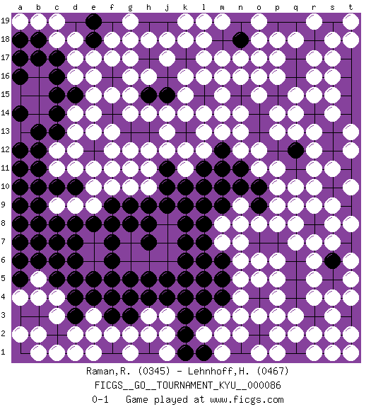 Last move : 0-1 2009 August 17 0:24:22 [Event "FICGS__GO__TOURNAMENT_KYU__000086"] [Site "FICGS"] [Date "2009.07.08"] [Round "1"] [Black "Raman,Ranganathan"] [White "Lehnhoff,Heinz-Georg"] [Result "0-1"] [Rating 1 "0345"] [Rating 2 "0467"] 1.k10 q10 2.q4 k4 3.d4 d16 4.q16 k16 5.d10 o3 6.o6 q3 7.r3 p3 8.p5 n8 9.l9 m8 10.n7 m7 11.m6 n5 12.m5 n4 13.l7 n6 14.o7 o8 15.p8 p9 16.l8 q8 17.p7 q7 18.q6 o5 19.m9 p6 20.q5 r6 21.r4 r2 22.q2 p2 23.q1 p1 24.r5 r1 25.n10 o11 26.n11 n12 27.m12 o12 28.s6 r7 29.l11 j6 30.k6 j7 31.k7 j8 32.k5 j5 33.j4 j3 34.h4 f4 35.k3 l4 36.m4 m3 37.l3 l2 38.l5 h3 39.g3 j2 40.m2 n3 41.k2 g4 42.l1 g2 43.f3 e3 44.f2 g1 45.s3 s2 46.t2 t4 47.s5 s7 48.t7 t8 49.t6 p4 50.t3 s1 51.n1 t1 52.o2 n2 53.o1 m1 54.n1 o1 55.h1 h2 56.f1 j1 57.e4 e2 58.g5 e1 59.q1 q2 60.h5 f5 61.f6 g6 62.e5 e6 63.f7 h6 64.k4 m1 65.f3 l2 66.k1 m2 67.g3 f2 68.d6 e7 69.e8 f4 70.g4 g7 71.d7 s4 72.f5 t5 73.o14 m14 74.n13 m13 75.o13 p13 76.p12 p11 77.q12 q13 78.q11 r11 79.r12 r13 80.s12 s11 81.s13 s14 82.o10 p10 83.t14 t12 84.t15 t13 85.p15 s15 86.t16 s16 87.t17 s17 88.r17 t18 89.r18 p18 90.j9 l12 91.m11 l13 92.g8 k11 93.h8 k12 94.j11 j12 95.k8 h11 96.j10 h10 97.h9 c3 98.d3 d2 99.h7 p14 100.o15 o16 101.n15 n16 102.m15 m16 103.l16 l17 104.l15 k15 105.l14 k14 106.p17 o17 107.p16 o18 108.k17 j17 109.j16 k18 110.h12 g12 111.h13 g11 112.g13 f13 113.e11 f12 114.f14 e13 115.e14 d14 116.d15 e15 117.c15 f15 118.g14 g15 119.h15 h16 120.j15 j14 121.h14 j13 122.c14 d13 123.c13 c12 124.b12 c11 125.d12 d11 126.e12 e10 127.b11 f11 128.b13 b15 129.c16 b16 130.c10 d9 131.b10 c9 132.b9 b8 133.c8 e9 134.d8 c4 135.a8 a10 136.a11 a13 137.a14 b14 138.b17 a15 139.a9 b7 140.f9 f10 141.c17 d17 142.b6 c18 143.b18 c19 144.a7 d18 145.c7 b4 146.d5 a4 147.a5 r16 148.q17 q15 149.p19 q18 150.s19 s18 151.q19 o19 152.n19 m19 153.n18 m17 154.m18 l19 155.c5 b5 156.a6 b19 157.a17 a19 158.f17 f18 159.e16 e17 160.f16 g17 161.c2 b2 162.c1 b1 163.a12 g18 164.a14 g16 165.a16 n9 166.o9 n14 167.g9 g10 168.a18 t19 169.l6 r19 170.o7 n7 171.a3 d1 172.j19 j18 173.b3 a2 174.h19 g19 175.l15 m15 176.f16 e16 177.e12 d12 178.p7 o6 179.l4 f17 180.f4 p8 181.m10 k19 182.j5 h18 183.l10 l18 184.f8 n17 185.k9 e11 186.h13 h14 187.g13 g14 188.f14 h12 189.c6 l14 190.b7 l16 191.b8 e14 192.a10 pass 193.r9 s9 194.r8 r10 195.s10 t10 196.s8 q9 197.q4 r4 198.q5 r5 199.s6 t6 200.q6 p5 201.o14 o15 202.o13 n13 203.q12 r12 204.q16 p16 205.q17 r17 206.r14 q14 207.t3 s3 208.r8 s8 209.n18 p17 210.e19 t2 211.j15 r9 212.e18 r15 213.c2 c1 214.h15 pass 0-1 Here are the names of the openings (joseki) played in the four corners : Corner q4 : q4 o3 Hoshi (Hwajeom, Seongjeom, Xingwei`) 4-4 Point. The star or hoshi (4-4) point, emphasizing influence at the potential expense of territory. Ikken Kakari (Hankan Keolch'im, Yi Gua`jiao~, 1-Space Low Approach). White 2 is the standard approach move to the 4-4. Corner q16 : q16 o11 Hoshi (Hwajeom, Seongjeom, Xingwei`) 4-4 Point. The star or hoshi (4-4) point, emphasizing influence at the potential expense of territory. Corner d4 : d4 j6 Hoshi (Hwajeom, Seongjeom, Xingwei`) 4-4 Point. The star or hoshi (4-4) point, emphasizing influence at the potential expense of territory. Corner d16 : d16 j11 Hoshi (Hwajeom, Seongjeom, Xingwei`) 4-4 Point. The star or hoshi (4-4) point, emphasizing influence at the potential expense of territory. Player White won this Go (weiqi, baduk) game. Follow this game move after move (download)Five groups might live but the six will die. (Anonymous) The real voyage of discovery consists not in seeking new lands but in seeing with new eyes. (Marcel Proust)