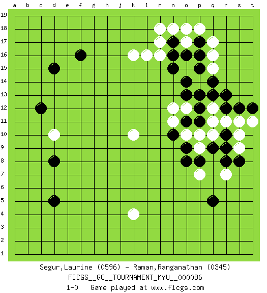 Last move : 1-0 2009 November 4 20:15:14 [Event "FICGS__GO__TOURNAMENT_KYU__000086"] [Site "FICGS"] [Date "2009.07.08"] [Round "1"] [Black "Segur,Laurine"] [White "Raman,Ranganathan"] [Result "1-0"] [Rating 1 "0596"] [Rating 2 "0345"] 1.d5 d10 2.d15 k10 3.q5 q10 4.c12 k4 5.r8 k16 6.f16 q16 7.o14 m16 8.o16 o18 9.n17 l16 10.p17 q17 11.p15 m18 12.n15 o17 13.n16 n18 14.p16 p18 15.q14 m17 16.r12 s10 17.r10 r11 18.r9 q11 19.s12 t11 20.t12 s11 21.o11 q12 22.r13 p13 23.p12 p14 24.q13 q15 25.d8 o12 26.o13 n12 27.p11 p10 28.o9 o10 29.n10 p9 30.o8 p7 31.p8 n11 32.p13 s9 33.s8 r7 34.q9 1-0 This go game has been lost on time (started : 2009.07.08 23:48:33) Here are the names of the openings (joseki) played in the four corners : Corner q16 : q16 o14 Hoshi (Hwajeom, Seongjeom, Xingwei`) 4-4 Point. The star or hoshi (4-4) point, emphasizing influence at the potential expense of territory. Player Black won this Go (weiqi, baduk) game. Follow this game move after move (download)The game plays itself, the players don't control it. (Pierre Audouard) Information on the Internet is subject to the same rules and regulations as conversation at a bar. (George Lundberg)