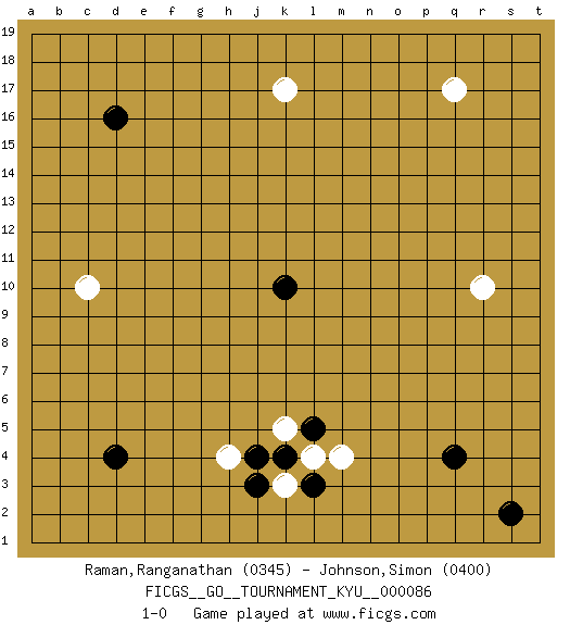 Last move : 1-0 2009 August 18 20:58:36 [Event "FICGS__GO__TOURNAMENT_KYU__000086"] [Site "FICGS"] [Date "2009.07.08"] [Round "1"] [Black "Raman,Ranganathan"] [White "Johnson,Simon"] [Result "1-0"] [Rating 1 "0345"] [Rating 2 "0400"] 1.k10 c10 2.q4 r10 3.k4 k3 4.d4 q17 5.d16 k17 6.s2 k5 7.l5 l4 8.j4 h4 9.l3 m4 10.j3 1-0 This go game has been lost on time (started : 2009.07.08 23:48:33) Here are the names of the openings (joseki) played in the four corners : Player Black won this Go (weiqi, baduk) game. Follow this game move after move (download)On the second line six die, eight live. (Anonymous) Any activity becomes creative when the doer cares about doing it right or doing it better. (John Updike)