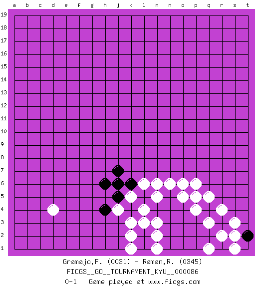 Last move : 0-1 2009 July 26 4:11:49 [Event "FICGS__GO__TOURNAMENT_KYU__000086"] [Site "FICGS"] [Date "2009.07.08"] [Round "1"] [Black "Gramajo,Francisco"] [White "Raman,Ranganathan"] [Result "0-1"] [Rating 1 "0031"] [Rating 2 "0345"] 1.q4 p5 2.o4 p6 3.n3 q5 4.p3 o5 5.n5 p4 6.o2 r4 7.r3 q3 8.o3 r2 9.q2 s3 10.r1 s1 11.t2 q1 12.p2 n6 13.p1 m5 14.m4 l4 15.n4 l3 16.l5 m6 17.n1 m2 18.l2 k2 19.l1 m3 20.k4 k3 21.k6 k1 22.j5 o6 23.n2 m1 24.j7 l6 25.r1 s2 26.o1 k5 27.h6 j4 28.h4 q1 29.j6 d4 0-1 Here are the names of the openings (joseki) played in the four corners : Corner q4 : q4 p5 Hoshi (Hwajeom, Seongjeom, Xingwei`) 4-4 Point. The star or hoshi (4-4) point, emphasizing influence at the potential expense of territory. Player White won this Go (weiqi, baduk) game. Follow this game move after move (download)Don't defend - extend ! (Bill Taylor) The only sure thing about luck is that it will change. (Wilson Mizner)