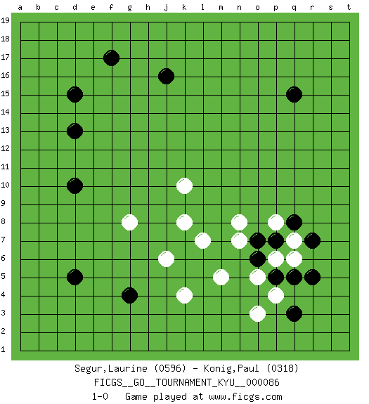 Last move : 1-0 2009 September 9 0:39:45 [Event "FICGS__GO__TOURNAMENT_KYU__000086"] [Site "FICGS"] [Date "2009.07.08"] [Round "1"] [Black "Segur,Laurine"] [White "Konig,Paul"] [Result "1-0"] [Rating 1 "0596"] [Rating 2 "0318"] 1.d5 k10 2.q5 k8 3.q15 l7 4.d15 j6 5.g4 m5 6.d10 k4 7.f17 g8 8.d13 n8 9.j16 o3 10.q8 p6 11.q3 p4 12.r5 q6 13.p5 o5 14.o7 p8 15.p7 n7 16.o6 q7 17.r7 1-0 Here are the names of the openings (joseki) played in the four corners : Corner q4 : q5 l7 Takamoku (Gomok, Gaomu`) 5-4 Point. The takamoku (high) point (5-4). With its emphasis on influence, the 5-4 point complements the 4-4 (hoshi) point in creating an influence-oriented fuseki. Corner d4 : d5 j6 Takamoku (Gomok, Gaomu`) 5-4 Point. The takamoku (high) point (5-4). With its emphasis on influence, the 5-4 point complements the 4-4 (hoshi) point in creating an influence-oriented fuseki. Player Black won this Go (weiqi, baduk) game. Follow this game move after move (download)The enemy's vital point is your own. (Anonymous) It's not enough to succeed. Others must fail. (Gore Vidal)