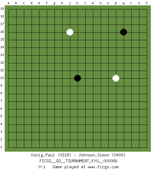 Last move : 0-1 2009 July 11 7:43:58 [Event "FICGS__GO__TOURNAMENT_KYU__000086"] [Site "FICGS"] [Date "2009.07.08"] [Round "1"] [Black "Konig,Paul"] [White "Johnson,Simon"] [Result "0-1"] [Rating 1 "0318"] [Rating 2 "0400"] 1.k10 p10 2.q16 j16 0-1 Here are the names of the openings (joseki) played in the four corners : Player White won this Go (weiqi, baduk) game. Follow this game move after move (download)Learn to play under the stones. (Anonymous) He who is a good ruler must first have been ruled. (Aristotle)