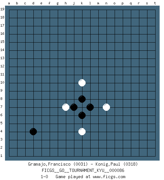Last move : 1-0 2009 July 11 7:44:16 [Event "FICGS__GO__TOURNAMENT_KYU__000086"] [Site "FICGS"] [Date "2009.07.08"] [Round "1"] [Black "Gramajo,Francisco"] [White "Konig,Paul"] [Result "1-0"] [Rating 1 "0031"] [Rating 2 "0318"] 1.d4 k10 2.k8 k4 3.l7 n7 4.k6 h7 5.j7 1-0 Here are the names of the openings (joseki) played in the four corners : Corner q4 : l7 n7 This joseki is unknown. A weak or weird move has probably been played in this corner. Corner d4 : d4 h7 Hoshi (Hwajeom, Seongjeom, Xingwei`) 4-4 Point. The star or hoshi (4-4) point, emphasizing influence at the potential expense of territory. Player Black won this Go (weiqi, baduk) game. Follow this game move after move (download)Don't make territory near thickness. (Anonymous) Beta. Software undergoes beta testing shortly before it's released. Beta is latin for still doesn't work. (Anonymous)