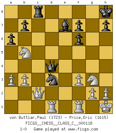 Last move : 1-0 2009 August 17 2:11:4 [Event "FICGS__CHESS__CLASS_C__000118"] [Site "FICGS"] [Date "2009.07.10"] [Round "1"] [White "von Buttlar,Paul"] [Black "Price,Eric"] [Result "1-0"] [WhiteElo "1723"] [BlackElo "1615"] 1.c4 e6 2.Nc3 Nf6 3.e4 e5 4.d4 exd4 5.Qxd4 Nc6 6.Qd1 Bb4 7.f3 O-O 8.Bd2 Re8 9.a3 Bf8 10.Bd3 Ne5 11.Be3 c6 12.Nge2 Kh8 13.O-O a6 14.b3 d5 15.cxd5 cxd5 16.Bc2 dxe4 17.Nxe4 Bd7 18.Bg5 Be7 19.Bxf6 gxf6 20.Qe1 Rc8 21.Qb1 Qb6+ 22.Kh1 Bb5 23.N4g3 Rxc2 24.Qxc2 Nd3 25.Nc3 Rc8 26.Rad1 Qd4 27.Nxb5 1-0 English Opening Kingside Castling by player Black (move 7) Kingside Castling by player White (move 13) Player White won this chess game. Follow this game move after move (download)Fischer is the strongest player in the world. In fact, the strongest player who ever lived. (Larry Evans) Schach ist Leben. (Robert James Fischer) Bobby solo arroja las piezas y solas caen en las casillas correctas. (Miguel Najdorf ) C'est la seule position que je connaisse où les deux camps sont mals. Propos prêtés à V. Anand. Always remember that you are unique; just like everyone else. (Unknown)