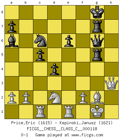 Last move : 0-1 2009 August 24 3:57:32 [Event "FICGS__CHESS__CLASS_C__000118"] [Site "FICGS"] [Date "2009.07.10"] [Round "1"] [White "Price,Eric"] [Black "Kepinski,Janusz"] [Result "0-1"] [WhiteElo "1615"] [BlackElo "1621"] 1.e4 e6 2.d3 d5 3.Nd2 c5 4.g3 Nc6 5.Bg2 g6 6.Ngf3 Bg7 7.O-O Nge7 8.Re1 O-O 9.c3 b6 10.e5 Qc7 11.Qe2 Ba6 12.Nf1 Rfe8 13.Bf4 h6 14.h4 Rad8 15.N1h2 h5 16.g4 d4 17.c4 hxg4 18.Nxg4 b5 19.Nf6+ Bxf6 20.exf6 Qxf4 21.fxe7 Rxe7 22.h5 bxc4 23.hxg6 cxd3 24.gxf7+ Qxf7 25.Qe4 Qg7 26.Rac1 Rd5 27.Qh4 Qg6 28.Qg3 Rg7 29.Qh3 d2 30.Nxd2 Rg5 0-1 French : King's Indian attack Kingside Castling by player White (move 7) Kingside Castling by player Black (move 8) Player Black won this chess game. Follow this game move after move (download)The laws of Chess do not permit a free choice: you have to move whether you like it or not. (Emanuel Lasker) Karpov ist ein Museumsstück. (Garry Kasparov) Tu cuerpo tiene que estar en óptima condición. Tu Ajedrez se deteriora como lo hace tu cuerpo. No puedes separar la mente y el cuerpo. (Bobby Fischer) Les Echecs, c'est l'art de la guerre sans les charniers, c'est la résurrection des morts tombés au champ d'honneur, l'espoir perpétuel, la suprématie de l'intelligence sur la force, la culture de l'esprit. (F. Szpiner) You can only get smarter by playing a smarter opponent. (Revolver, movie)