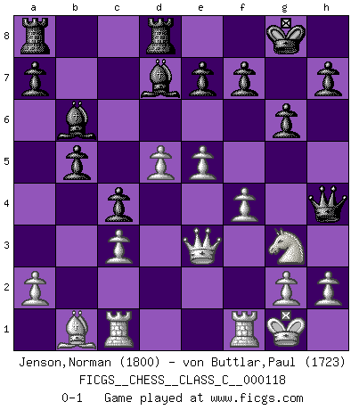 Last move : 0-1 2009 October 30 18:44:49 [Event "FICGS__CHESS__CLASS_C__000118"] [Site "FICGS"] [Date "2009.07.10"] [Round "1"] [White "Jenson,Norman"] [Black "von Buttlar,Paul"] [Result "0-1"] [WhiteElo "1800"] [BlackElo "1723"] 1.d4 Nf6 2.c4 g6 3.Nc3 d5 4.cxd5 Nxd5 5.e4 Nxc3 6.bxc3 Bg7 7.Bc4 O-O 8.Ne2 c5 9.O-O Nc6 10.Be3 Qc7 11.Rc1 Rd8 12.Bf4 Qd7 13.d5 Ne5 14.Bb3 c4 15.Bc2 b5 16.Bb1 Qg4 17.Bxe5 Bxe5 18.Ng3 Qh4 19.Qf3 Bg4 20.Qe3 Bd7 21.f4 Bc7 22.e5 Bb6 0-1 King's Indian defense, 3.Nc3 Kingside Castling by player Black (move 7) Kingside Castling by player White (move 9) Player Black won this chess game. Follow this game move after move (download)In order to improve your game, you must study the endgame before everything else, for whereas the endings can be studied and mastered by themselves, the middle game and the opening must be studied in relation to the endgame. (Jose Raul Capablanca) Zeige mir drei Eröffnungsvarianten und ich beweise dir, dass zwei davon inkorrekt sind. (Emanuel Lasker) Jugadores de primera clase pierden en contra de jugadores de segunda clase porque los jugadores de segunda clase a veces juegan una partida de primer clase. (Siegbert Tarrasch) Il (Jacob Murray) ne joue pas pour le bon coup, mais pour le meilleur. (Eloi Relange) Hold em is to stud what chess is to checkers. (Johnny Moss)
