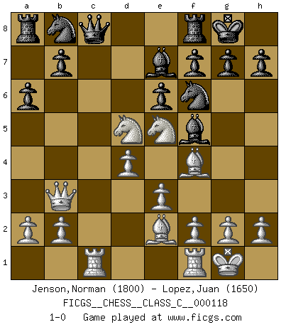 Last move : 1-0 2009 October 16 9:8:2 [Event "FICGS__CHESS__CLASS_C__000118"] [Site "FICGS"] [Date "2009.07.10"] [Round "1"] [White "Jenson,Norman"] [Black "Lopez,Juan"] [Result "1-0"] [WhiteElo "1800"] [BlackElo "1650"] 1.d4 c6 2.c4 d5 3.cxd5 cxd5 4.Nf3 Bf5 5.Qb3 Qc7 6.Nc3 e6 7.Bf4 Qd7 8.e3 a6 9.Ne5 Qc8 10.Rc1 Nf6 11.Be2 Be7 12.O-O O-O 13.Nxd5 1-0 Queen's pawn Kingside Castling by player White (move 12) Kingside Castling by player Black (move 12) Player White won this chess game. Follow this game move after move (download)When asked, -How is that you pick better moves than your opponents?, I responded: I'm very glad you asked me that, because, as it happens, there is a very simple answer. I think up my own moves, and I make my opponent think up his. (Alexander Alekhine) Es ist schade, dass viele Schachsportler vergessen, wie wichtig Auftreten und angemessene Kleidung sind. (Alexandra Kosteniuk) Los errores estan ahí, esperando a que se cometan. (Savielly Tartakower) A ce moment-là, je menaçais de comprendre la position ! (Clément L'Heureux) A mistake is only a mistake if you let it happen twice. Otherwise it is a learning experience. (Daniel Parmet)