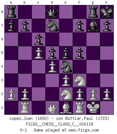 Last move : 0-1 2009 October 26 19:35:34 [Event "FICGS__CHESS__CLASS_C__000118"] [Site "FICGS"] [Date "2009.07.10"] [Round "1"] [White "Lopez,Juan"] [Black "von Buttlar,Paul"] [Result "0-1"] [WhiteElo "1650"] [BlackElo "1723"] 1.d4 Nf6 2.c4 g6 3.Nc3 d5 4.Nf3 Bg7 5.e3 O-O 6.Bd3 c6 7.O-O Bf5 8.Bxf5 gxf5 9.c5 Ne4 10.Bd2 Nd7 11.Ne2 e5 12.Rb1 Kh8 13.Be1 Rg8 0-1 King's Indian defense, 3.Nc3 Kingside Castling by player Black (move 5) Kingside Castling by player White (move 7) Player Black won this chess game. Follow this game move after move (download)Castle early and often. (Rob Sillars) Es ist nicht das erste mal, dass sich die FIDE dem Arabischen Geld gebeugt hat (über die FIDE WM 2004 in Lybien). (Larry Evans) El Ajedrez es un terrible juego. Si no controlas el centro, tu oponente tiene una posición mas holgada. Si tienes control del centro, ¡entonces realmente tu tienes algo de que preocuparte!. (Siegbert Tarrasch) RxDa4 pat (...) Wisdom is the reward you get for a lifetime of listening when you'd have preferred to talk. (Doug Larson)