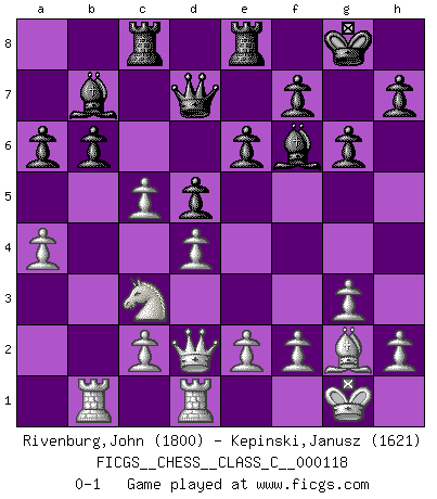 Last move : 0-1 2009 November 30 21:5:12 [Event "FICGS__CHESS__CLASS_C__000118"] [Site "FICGS"] [Date "2009.07.10"] [Round "1"] [White "Rivenburg,John"] [Black "Kepinski,Janusz"] [Result "0-1"] [WhiteElo "1800"] [BlackElo "1621"] 1.b4 g6 2.Nf3 Bg7 3.Nc3 Nf6 4.g3 d5 5.Bg2 O-O 6.O-O b6 7.d4 Bb7 8.Bf4 Nbd7 9.Rc1 e6 10.Qd2 Rc8 11.Rfd1 Nh5 12.Bg5 Bf6 13.Bh6 Bg7 14.Rb1 Re8 15.a4 a6 16.Bg5 Nhf6 17.Ne5 c5 18.bxc5 Qc7 19.Bxf6 Bxf6 20.Nxd7 Qxd7 0-1 This chess game has been lost on time (started : 2009.07.10 23:24:20) Polish (Sokolsky) opening Kingside Castling by player Black (move 5) Kingside Castling by player White (move 6) Player Black won this chess game. Follow this game move after move (download)Chess problems demand from the composer the same virtues that characterize all worthwhile art: originality, invention, conciseness, harmony, complexity, and splendid insincerity. (Vladimir Nabokov) Der Partner hat auch seine Existenzberechtigung. (Savielly Grigorievitsch Tartakower) De eso se trata el Ajedrez. Un día le das una lección a tu oponente y al día siguiente el te da una a tí. (Bobby Fischer) Les Echecs ont trois composantes : le temps, l'espace et le matériel en dernier. (Mikhail Tal) Convictions are more dangerous enemies of truth than lies. (Friedrich Nietzsche)