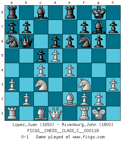 Last move : 0-1 2009 October 13 9:0:6 [Event "FICGS__CHESS__CLASS_C__000118"] [Site "FICGS"] [Date "2009.07.10"] [Round "1"] [White "Lopez,Juan"] [Black "Rivenburg,John"] [Result "0-1"] [WhiteElo "1650"] [BlackElo "1800"] 1.d4 Nf6 2.c4 c5 3.d5 Na6 4.Nc3 d6 5.e4 g6 6.Nf3 Bg7 7.Be2 O-O 8.O-O Qb6 9.h3 e6 10.a3 Re8 0-1 Benoni defense Kingside Castling by player Black (move 7) Kingside Castling by player White (move 8) Player Black won this chess game. Follow this game move after move (download)It began to feel as though you were playing against Chess itself. - On playing against Robert Fischer. (Walter Shipman) Ein typischer, sehr verbreiteter Gedankenschädling ist der, daß der betreffende Amateur von der Annanhme ausgeht, daß jeder einzelne Zug etwas zu leisten habe. (Aaron Nimzowitsch) ¿Cual es el objetivo de jugar una apertura de gambito?... Para adquirir una reputación de ser un jugador apuesto a costo de perder el juego. (Siegbert Tarrasch) Le système Elo représente seulement une moyenne. Il est simplement un indicateur de votre stabilité. (Anatoli Karpov) The good fighters of old first put themselves beyond the possibility of defeat, and then waited for an opportunity of defeating the enemy. (Sun Tzu)