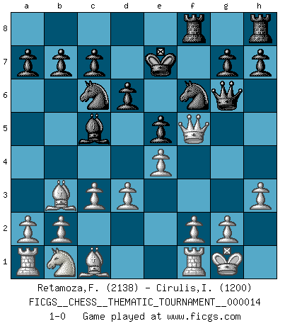 Last move : 1-0 2006 October 3 21:13:18 [Event "FICGS__CHESS__THEMATIC_TOURNAMENT__000014"] [Site "FICGS"] [Date "2006.09.20"] [Round "1"] [White "Retamoza,Francisco"] [Black "Cirulis,Ilmars"] [Result "1-0"] [WhiteElo "2138"] [BlackElo "1200"] 1.e4 e5 2.Nf3 Nc6 3.Bc4 Nf6 4.Ng5 Bc5 5.Bxf7+ Kf8 6.Bb3 Qe8 7.d3 d6 8.c3 Bg4 9.Nf3 Qg6 10.h3 Bxf3 11.Qxf3 Ke7 12.O-O Raf8 13.Qf5 1-0 Two knights defense : Wilkes Barre (Traxler) variation Kingside Castling by player White (move 12) Player White won this chess game. Follow this game move after move (download)A thorough understanding of the typical mating continuations makes the most complicated sacrificial combinations leading up to them not only not difficult, but almost a matter of course. (Siegbert Tarrasch) Jeder weiß, dass Gasprom Putins persönliches Machtinstrument ist. Die Firma wird vom Kreml aus geleitet und wird schon deshalb nie transparent sein. (Garry Kasparov) Mi estilo es algo parecido entre un poco de Tal y Petrosian. (Reshevsky) Ne tendez aucun piège pour le plaisir ! Ne jouez rien dans l'espoir que l'adversaire réagisse de façon stupide ! Prenez toujours pour acquis que l'adversaire va trouver le meilleur coup ! Ne jouez jamais de coup dans l'espoir que l'adversaire ne voie pas la menace ! Chacun de vos coups doit améliorer la position d'une façon ou d'une autre. Beta. Software undergoes beta testing shortly before it's released. Beta is latin for still doesn't work. (Anonymous)