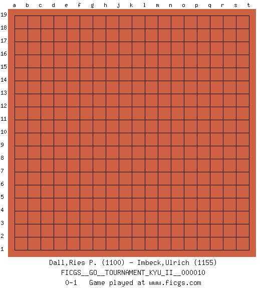 Last move : 0-1 2009 August 12 13:4:16 [Event "FICGS__GO__TOURNAMENT_KYU_II__000010"] [Site "FICGS"] [Date "2009.07.13"] [Round "1"] [Black "Dall,Ries P."] [White "Imbeck,Ulrich"] [Result "0-1"] [Rating 1 "1100"] [Rating 2 "1155"] 0-1 This go game has been lost on time (started : 2009.07.13 3:17:52) Here are the names of the openings (joseki) played in the four corners : Player White won this Go (weiqi, baduk) game. Follow this game move after move (download)Big groups never die. (Anonymous) Vladimir Ras-Putin is still alive... He is also a good actor, I saw him in the Lord of the Rings. (Rodolfo d'Ettorre)