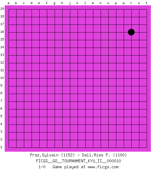 Last move : 1-0 2009 August 12 20:6:28 [Event "FICGS__GO__TOURNAMENT_KYU_II__000010"] [Site "FICGS"] [Date "2009.07.13"] [Round "1"] [Black "Praz,Sylvain"] [White "Dall,Ries P."] [Result "1-0"] [Rating 1 "1152"] [Rating 2 "1100"] 1.r16 1-0 This go game has been lost on time (started : 2009.07.13 3:17:52) Here are the names of the openings (joseki) played in the four corners : Player Black won this Go (weiqi, baduk) game. Follow this game move after move (download)To emphasize the lack of determination in his moves, one speaks of chance. (Pierre Audouard) Logic : The art of thinking and reasoning in strict accordance with the limitations and incapacities of the human misunderstanding. (Ambrose Bierce)