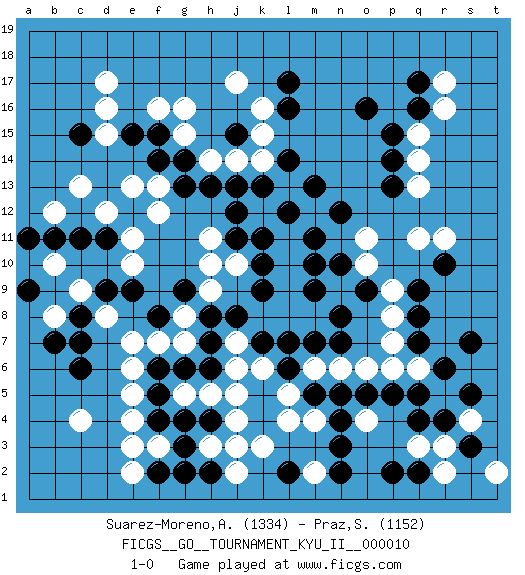 Last move : 1-0 2009 July 21 1:5:49 [Event "FICGS__GO__TOURNAMENT_KYU_II__000010"] [Site "FICGS"] [Date "2009.07.13"] [Round "1"] [Black "Suarez-Moreno,Alejandro"] [White "Praz,Sylvain"] [Result "1-0"] [Rating 1 "1334"] [Rating 2 "1152"] 1.q17 c4 2.q4 d17 3.c15 c13 4.e15 f16 5.f15 g16 6.c11 d12 7.c8 f13 8.g14 e10 9.e12 e13 10.d11 f12 11.d9 e11 12.c6 e3 13.n3 q15 14.o16 r17 15.q16 r16 16.l17 j17 17.j15 k16 18.l16 k15 19.j13 g15 20.f14 h14 21.h13 j14 22.g13 h11 23.j11 j10 24.k11 h9 25.q9 r11 26.r10 q11 27.m10 l9 28.m9 l10 29.m11 l11 30.l12 m12 31.m13 k12 32.k13 l13 33.l14 k14 34.l12 d15 35.j12 d16 36.p13 q13 37.p15 q14 38.p14 k3 39.f8 e7 40.e9 f7 41.g9 g8 42.l7 k6 43.l6 l5 44.k7 j6 45.h7 g7 46.h8 h10 47.h6 h5 48.g6 g5 49.f6 e6 50.f5 e5 51.m5 l4 52.f4 j7 53.j8 m4 54.n5 l8 55.k10 m8 56.n8 n9 57.n7 k8 58.n12 e4 59.g3 h3 60.h4 j4 61.g4 j5 62.h2 j3 63.f2 f3 64.g2 m2 65.n2 j2 66.l2 e2 67.k9 o4 68.n4 o6 69.o5 p6 70.r6 p9 71.q8 p8 72.q7 p7 73.o9 o10 74.n10 o11 75.q5 r3 76.q2 r2 77.r4 q3 78.p2 s4 79.s5 t2 80.s3 q6 81.s7 m6 82.m7 n6 83.p5 b10 84.b11 b8 85.b7 c9 86.a9 d8 87.c7 b12 88.a11 1-0 Here are the names of the openings (joseki) played in the four corners : Corner d16 : d17 c15 Komoku (Somok, Xiao~mu`) 3-4 Point. The komoku (3-4) point is the traditional corner enclosure move.. Ikken Kakari (Hankan Keolch'im, Yi Gua`jiao~, 1-Space Low Pincer). The small knight move is the basic approach move to the 3-4 point stone. It has been continually used for over four centuries. There are limitless variations, with new moves constantly being discovered. Black 2 opens the door to a treaure store of joseki. Corner d4 : c4 c8 Komoku (Somok, Xiao~mu`) 3-4 Point. The komoku (3-4) point is the traditional corner enclosure move.. Corner q16 : q17 q15 Komoku (Somok, Xiao~mu`) 3-4 Point. The komoku (3-4) point is the traditional corner enclosure move.. Ikken Takagakari (Hankan Nop'dakeolch'im, Yi Gaogua`jiao~, 1-Space High Approach). The 5-4 approach move has become more popular in modern times, as modern Go emphasizes speed and influence. Player Black won this Go (weiqi, baduk) game. Follow this game move after move (download)I really believe that Go is destined to take the place of Chess as the leading intellectual game of the Occident, just as it has reigned supreme in the Orient for some four thousand years. (Edward Lasker, international chess master) The intuitive mind is a sacred gift; the rational mind is a faithful servant. We have created a society that honors the servant but has forgotten the gift. (Albert Einstein)