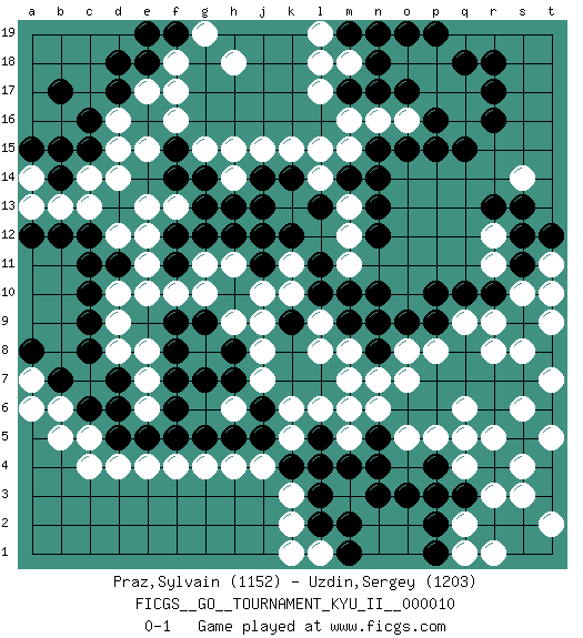 Last move : 0-1 2009 August 1 1:18:57 [Event "FICGS__GO__TOURNAMENT_KYU_II__000010"] [Site "FICGS"] [Date "2009.07.13"] [Round "1"] [Black "Praz,Sylvain"] [White "Uzdin,Sergey"] [Result "0-1"] [Rating 1 "1152"] [Rating 2 "1203"] 1.r16 d4 2.d17 d15 3.q3 f16 4.c15 d14 5.c16 k3 6.q10 p17 7.p16 o16 8.p15 q17 9.r17 l17 10.o15 n16 11.n15 f18 12.n10 p5 13.n3 r5 14.r7 s3 15.n5 p3 16.p2 q4 17.o3 q2 18.p4 r3 19.p3 k5 20.p6 q6 21.q7 c14 22.c6 c5 23.d6 f4 24.c10 o8 25.n8 o7 26.o6 n7 27.o9 m7 28.p7 p8 29.q8 d9 30.c9 d8 31.c8 m15 32.m14 m12 33.n12 m13 34.n13 l14 35.n14 k15 36.k12 m8 37.l10 j8 38.l13 k11 39.j11 k10 40.k9 j10 41.l11 l9 42.k14 l15 43.j14 h11 44.j12 h15 45.h12 g11 46.e16 e15 47.f14 e17 48.d18 d10 49.d11 e11 50.c12 d12 51.c11 j9 52.f6 h6 53.g5 g4 54.h5 e6 55.e5 e7 56.d5 c4 57.f5 e4 58.e18 f17 59.f12 e12 60.f11 f10 61.g12 h4 62.r6 q5 63.s5 r1 64.f19 g19 65.e19 h18 66.b14 b13 67.b15 c13 68.b12 t2 69.f7 b6 70.b7 b5 71.q18 p18 72.r18 a13 73.a12 s4 74.l2 k2 75.h7 s6 76.s7 t5 77.j6 k6 78.g9 h9 79.h8 g10 80.d7 e8 81.f9 j7 82.j5 j4 83.l3 l1 84.m1 k1 85.m2 g8 86.f8 e10 87.g7 m5 88.m4 t7 89.t8 s8 90.t6 k13 91.j13 t7 92.s9 t9 93.t10 s10 94.t8 m11 95.m10 t9 96.o17 r9 97.s11 r11 98.r10 t11 99.s12 o18 100.m9 l8 101.p9 q16 102.q15 r12 103.s13 q9 104.p10 j15 105.n17 m16 106.n18 m18 107.o19 r8 108.l5 m6 109.l4 o5 110.p19 h14 111.f15 d16 112.b17 g15 113.g14 e13 114.m19 l19 115.m17 n19 116.n4 n6 117.m19 l18 118.n19 a7 119.a8 a6 120.p1 l6 121.k4 a14 122.a15 q1 123.t12 t10 124.n9 s14 125.r13 pass 126.h13 f13 127.g13 pass 0-1 Here are the names of the openings (joseki) played in the four corners : Corner d16 : d17 d15 Komoku (Somok, Xiao~mu`) 3-4 Point. The komoku (3-4) point is the traditional corner enclosure move.. Ikken Takagakari (Hankan Nop'dakeolch'im, Yi Gaogua`jiao~, 1-Space High Approach). The 5-4 approach move has become more popular in modern times, as modern Go emphasizes speed and influence. Corner q16 : r16 p17 Komoku (Somok, Xiao~mu`) 3-4 Point. The komoku (3-4) point is the traditional corner enclosure move.. Ikken Kakari (Hankan Keolch'im, Yi Gua`jiao~, 1-Space Low Pincer). The small knight move is the basic approach move to the 3-4 point stone. It has been continually used for over four centuries. There are limitless variations, with new moves constantly being discovered. White 2 opens the door to a treaure store of joseki. Corner q4 : q3 p5 Komoku (Somok, Xiao~mu`) 3-4 Point. The komoku (3-4) point is the traditional corner enclosure move.. Corner d4 : d4 c6 Hoshi (Hwajeom, Seongjeom, Xingwei`) 4-4 Point. The star or hoshi (4-4) point, emphasizing influence at the potential expense of territory. Ikken Kakari (Hankan Keolch'im, Yi Gua`jiao~, 1-Space Low Approach). Black 2 is the standard approach move to the 4-4. Player White won this Go (weiqi, baduk) game. Follow this game move after move (download)Do not make moves that strengthen your opponent ! (Anonymous) There are three kinds of lies: lies, damned lies and statistics. (Mark Twain)