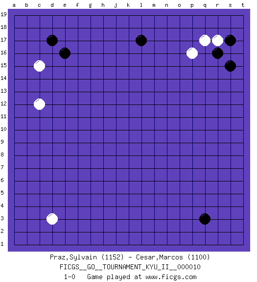 Last move : 1-0 2009 August 23 21:20:13 [Event "FICGS__GO__TOURNAMENT_KYU_II__000010 "] [Site "FICGS"] [Date "2009.07.13"] [Round "1"] [Black "Praz,Sylvain "] [White "Cesar,Marcos "] [Result "1-0"] [Rating 1 "1152"] [Rating 2 "1100"] 1.r16 d3 2.d17 p16 3.q3 c15 4.e16 r17 5.s17 q17 6.s15 c12 7.l17 1-0 This go game has been lost on time (started : 2009.07.13 3:17:52) Here are the names of the openings (joseki) played in the four corners : Corner q16 : r16 p16Komoku (Somok, Xiao~mu`) 3-4 Point. The komoku (3-4) point is the traditional corner enclosure move..Ikken Takagakari (Hankan Nop'dakeolch'im, Yi Gaogua`jiao~, 1-Space High Approach). The 5-4 approach move has become more popular in modern times, as modern Go emphasizes speed and influence. Corner d16 : d17 c15Komoku (Somok, Xiao~mu`) 3-4 Point. The komoku (3-4) point is the traditional corner enclosure move..Ikken Kakari (Hankan Keolch'im, Yi Gua`jiao~, 1-Space Low Pincer). The small knight move is the basic approach move to the 3-4 point stone. It has been continually used for over four centuries. There are limitless variations, with new moves constantly being discovered. White 2 opens the door to a treaure store of joseki. Corner q4 : q3 1-0Komoku (Somok, Xiao~mu`) 3-4 Point. The komoku (3-4) point is the traditional corner enclosure move.. Player Black won this Go (weiqi, baduk) game.Follow this game move after move (download ) Beware of the clumsy double contact. (Anonymous) I know the human being and fish can coexist peacefully. (George W. Bush, Saginaw sept. 29, 2000)