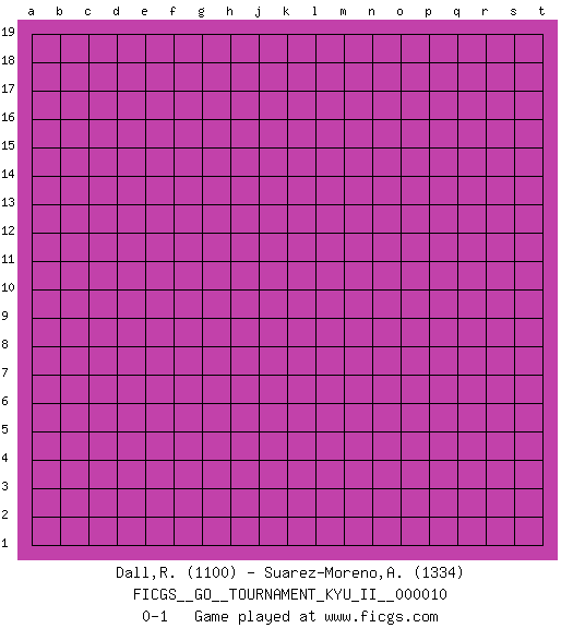 Last move : 0-1 2009 August 12 13:4:16 [Event "FICGS__GO__TOURNAMENT_KYU_II__000010"] [Site "FICGS"] [Date "2009.07.13"] [Round "1"] [Black "Dall,Ries P."] [White "Suarez-Moreno,Alejandro"] [Result "0-1"] [Rating 1 "1100"] [Rating 2 "1334"] 0-1 This go game has been lost on time (started : 2009.07.13 3:17:52) Here are the names of the openings (joseki) played in the four corners : Player White won this Go (weiqi, baduk) game. Follow this game move after move (download)Each step in a ladder is worth 7 points. (Anonymous) 98% of all statistics are made up. (Author unknown)