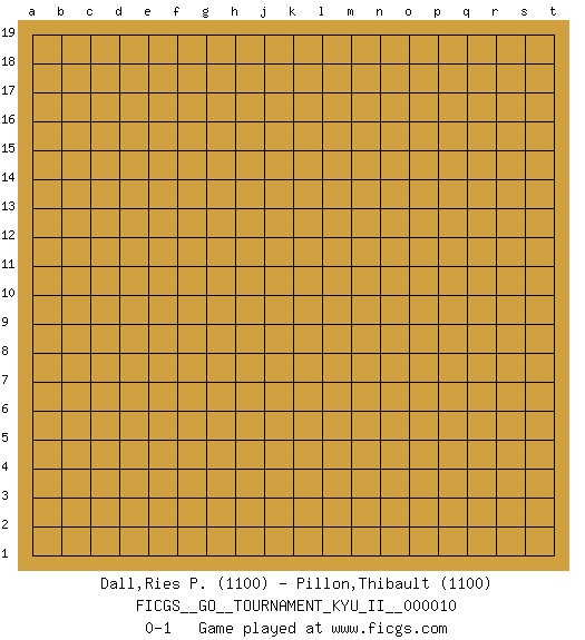 Last move : 0-1 2009 August 12 13:4:16 [Event "FICGS__GO__TOURNAMENT_KYU_II__000010"] [Site "FICGS"] [Date "2009.07.13"] [Round "1"] [Black "Dall,Ries P."] [White "Pillon,Thibault"] [Result "0-1"] [Rating 1 "1100"] [Rating 2 "1100"] 0-1 This go game has been lost on time (started : 2009.07.13 3:17:52) Here are the names of the openings (joseki) played in the four corners : Player White won this Go (weiqi, baduk) game. Follow this game move after move (download)You have to like to win, and to learn to recognize the errors that gave you the victory. (Pierre Audouard) The man who strikes first admits that his ideas have given out. (Chinese proverb)
