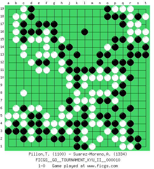 Last move : 1-0 2009 July 21 0:48:20 [Event "FICGS__GO__TOURNAMENT_KYU_II__000010"] [Site "FICGS"] [Date "2009.07.13"] [Round "1"] [Black "Pillon,Thibault"] [White "Suarez-Moreno,Alejandro"] [Result "1-0"] [Rating 1 "1100"] [Rating 2 "1334"] 1.q17 d3 2.d16 q4 3.r12 c8 4.r6 c14 5.g17 b17 6.c15 b15 7.c16 b16 8.d14 c13 9.o4 p5 10.r3 q3 11.r4 m4 12.n5 n4 13.o5 m5 14.n7 p7 15.q8 m7 16.o7 m8 17.p8 o3 18.p3 p2 19.p4 n2 20.q5 q2 21.d5 c5 22.d4 c4 23.e3 d2 24.e2 h4 25.h3 f4 26.e4 g3 27.g2 j3 28.h2 n10 29.c6 d6 30.c3 b6 31.b4 b5 32.b3 e6 33.j4 h5 34.k4 k6 35.l6 m6 36.l5 k8 37.j6 h6 38.j7 j5 39.l4 k7 40.d13 d12 41.e12 e11 42.f12 f11 43.l16 h12 44.h13 j13 45.j14 g13 46.h14 e13 47.e14 f13 48.k13 p11 49.p14 q13 50.q12 p13 51.p12 o12 52.o13 o14 53.n13 q14 54.p15 r16 55.q15 r15 56.r14 s14 57.r13 r17 58.q18 r18 59.s13 t15 60.j12 h11 61.c17 c18 62.d18 c19 63.d19 b18 64.r2 l7 65.q11 p10 66.j11 j10 67.k10 j9 68.o11 n11 69.n12 o10 70.s18 q19 71.p18 p19 72.o19 r19 73.o18 f14 74.e16 f16 75.f17 h15 76.g15 f15 77.g16 e15 78.f3 g4 79.m11 m10 80.l11 l2 81.k2 l3 82.k3 d15 83.e17 q10 84.r10 a4 85.a3 a5 86.c2 o8 87.p6 n8 88.q9 p9 89.e5 f5 90.t13 s17 91.s15 s16 92.t14 t18 93.s15 t16 94.l1 m1 95.k1 r1 96.s1 q1 97.s2 l10 98.k9 l9 99.k11 1-0 Here are the names of the openings (joseki) played in the four corners : Corner q4 : q4 r6 Hoshi (Hwajeom, Seongjeom, Xingwei`) 4-4 Point. The star or hoshi (4-4) point, emphasizing influence at the potential expense of territory. Ikken Kakari (Hankan Keolch'im, Yi Gua`jiao~, 1-Space Low Approach). Black 2 is the standard approach move to the 4-4. Corner d16 : d16 c14 Hoshi (Hwajeom, Seongjeom, Xingwei`) 4-4 Point. The star or hoshi (4-4) point, emphasizing influence at the potential expense of territory. Ikken Kakari (Hankan Keolch'im, Yi Gua`jiao~, 1-Space Low Approach). White 2 is the standard approach move to the 4-4. Player Black won this Go (weiqi, baduk) game. Follow this game move after move (download)There are players who don't accept exchange: they play many moves that perpetuate a previous state of the game. (Pierre Audouard) He who defends everything defends nothing. (Frederick the Great)