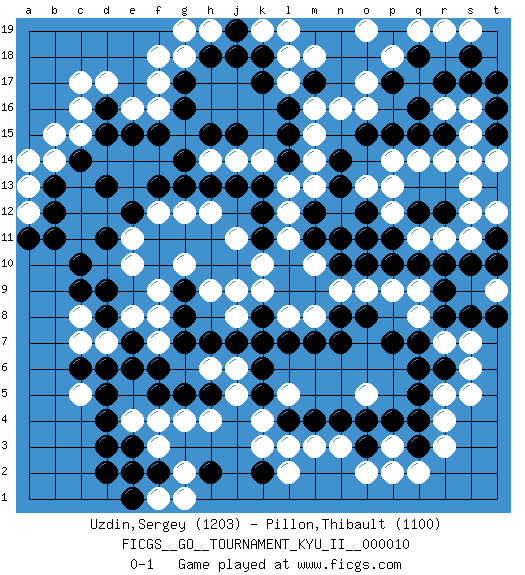 Last move : 0-1 2009 July 22 23:47:38 [Event "FICGS__GO__TOURNAMENT_KYU_II__000010"] [Site "FICGS"] [Date "2009.07.13"] [Round "1"] [Black "Uzdin,Sergey"] [White "Pillon,Thibault"] [Result "0-1"] [Rating 1 "1203"] [Rating 2 "1100"] 1.q16 d17 2.d4 r3 3.q4 r4 4.q5 p2 5.o3 r5 6.q6 r7 7.d15 f16 8.c10 o17 9.m17 m16 10.l16 n16 11.l15 l17 12.k17 l18 13.k18 m18 14.g17 q14 15.p15 p14 16.p17 r16 17.r17 s16 18.s17 r14 19.o15 m14 20.n14 m15 21.n13 f3 22.e3 f4 23.d6 k3 24.r10 q9 25.q12 p12 26.p11 q11 27.q10 r11 28.r12 s11 29.s10 s12 30.o12 p13 31.p10 c15 32.c14 c16 33.d13 k14 34.l14 l13 35.j15 m13 36.k13 j14 37.h15 h14 38.k12 p18 39.q18 o19 40.m12 l12 41.k11 l11 42.g14 k10 43.h13 j11 44.j13 o5 45.m4 l5 46.p7 p9 47.n7 o9 48.o11 s19 49.n10 m8 50.n8 n9 51.m7 l8 52.l7 n3 53.n4 m3 54.l4 k4 55.k5 j5 56.k6 j6 57.j7 h9 58.h7 l3 59.o4 f9 60.d8 f17 61.g16 c5 62.d5 c7 63.c6 d7 64.e7 c8 65.c9 e2 66.d2 e4 67.d3 f12 68.f13 j9 69.m11 m10 70.o10 q19 71.t16 s15 72.t11 s13 73.r6 s6 74.s8 s7 75.r8 q8 76.r9 t9 77.t8 g12 78.t10 n12 79.n11 o13 80.h5 h4 81.g5 g4 82.f5 b14 83.b13 b15 84.q15 o16 85.t15 t14 86.t17 t12 87.r15 s14 88.s18 r19 89.f2 g2 90.e1 o2 91.h2 g1 92.d16 c17 93.f15 g18 94.h18 f18 95.e12 e11 96.d11 e10 97.k8 k9 98.q7 e8 99.d9 f7 100.e6 p3 101.p4 a13 102.b12 a12 103.a11 a14 104.b11 h12 105.g13 h19 106.j19 g19 107.o8 e16 108.e15 l19 109.g8 f8 110.g9 g10 111.g7 s5 112.q3 q2 113.f6 k19 114.j18 f1 115.e2 j8 116.k7 h6 117.k2 l2 0-1 Here are the names of the openings (joseki) played in the four corners : Corner q4 : r3 q4 San-San (Sam-Sam, San-San) 3-3 Point. The San-San (3-3) point, emphasizing territory at the expense of influence. Kata-tsuki (shoulder hit). The shoulder-hit is the traditional answer to the 3-3. The direction of White 3 depends on the positions on the side. Crawling once may be the premise for a follow-up move of sliding with a knight's move in the opposite direction. If White plays 3 at 3-4 (to the right), the follow-on knight's move is then played at the top (e.g. 3-4, 4-5, 5-2). White's knight's move reduces territory potential on the side it is played. Corner d16 : d17 d15 Komoku (Somok, Xiao~mu`) 3-4 Point. The komoku (3-4) point is the traditional corner enclosure move.. Ikken Takagakari (Hankan Nop'dakeolch'im, Yi Gaogua`jiao~, 1-Space High Approach). The 5-4 approach move has become more popular in modern times, as modern Go emphasizes speed and influence. Corner q16 : q16 o17 Hoshi (Hwajeom, Seongjeom, Xingwei`) 4-4 Point. The star or hoshi (4-4) point, emphasizing influence at the potential expense of territory. Ikken Kakari (Hankan Keolch'im, Yi Gua`jiao~, 1-Space Low Approach). White 2 is the standard approach move to the 4-4. Corner d4 : d4 f3 Hoshi (Hwajeom, Seongjeom, Xingwei`) 4-4 Point. The star or hoshi (4-4) point, emphasizing influence at the potential expense of territory. Ikken Kakari (Hankan Keolch'im, Yi Gua`jiao~, 1-Space Low Approach). White 2 is the standard approach move to the 4-4. Player White won this Go (weiqi, baduk) game. Follow this game move after move (download)With less than 15 stones in danger, tenuki. (Anonymous) Thus, what is of supreme importance in war is to attack the enemy's strategy. (Sun Tzu)