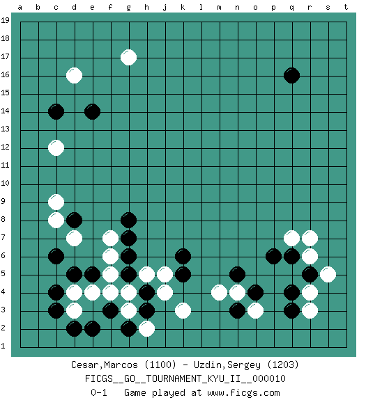 Last move : 0-1 2009 September 12 10:1:13 [Event "FICGS__GO__TOURNAMENT_KYU_II__000010 "] [Site "FICGS"] [Date "2009.07.13"] [Round "1"] [Black "Cesar,Marcos "] [White "Uzdin,Sergey "] [Result "0-1"] [Rating 1 "1100"] [Rating 2 "1203"] 1.q4 d16 2.q16 d3 3.d5 f4 4.d8 k3 5.c14 c12 6.e14 c9 7.c3 c8 8.d2 d4 9.c4 g17 10.f3 e4 11.e5 o3 12.g5 g4 13.h4 h5 14.h3 f5 15.g6 f6 16.g7 f7 17.g8 d7 18.c6 r6 19.q6 q7 20.p6 r3 21.r5 r7 22.q3 s5 23.o4 r4 24.k5 n4 25.n3 j5 26.k6 j4 27.e2 g3 28.g2 h2 29.n5 m4 0-1 This go game has been lost on time (started : 2009.07.13 3:17:52) Here are the names of the openings (joseki) played in the four corners : Corner d4 : d3 d5Komoku (Somok, Xiao~mu`) 3-4 Point. The komoku (3-4) point is the traditional corner enclosure move..Ikken Takagakari (Hankan Nop'dakeolch'im, Yi Gaogua`jiao~, 1-Space High Approach). The 5-4 approach move has become more popular in modern times, as modern Go emphasizes speed and influence. Corner d16 : d16 c14Hoshi (Hwajeom, Seongjeom, Xingwei`) 4-4 Point. The star or hoshi (4-4) point, emphasizing influence at the potential expense of territory.Ikken Kakari (Hankan Keolch'im, Yi Gua`jiao~, 1-Space Low Approach). Black 2 is the standard approach move to the 4-4. Corner q4 : q4 o3Hoshi (Hwajeom, Seongjeom, Xingwei`) 4-4 Point. The star or hoshi (4-4) point, emphasizing influence at the potential expense of territory.Ikken Kakari (Hankan Keolch'im, Yi Gua`jiao~, 1-Space Low Approach). White 2 is the standard approach move to the 4-4. Player White won this Go (weiqi, baduk) game.Follow this game move after move (download ) Don't defend - extend ! (Bill Taylor) The absolute truth is the thing that makes people laugh. (Carl Reiner)