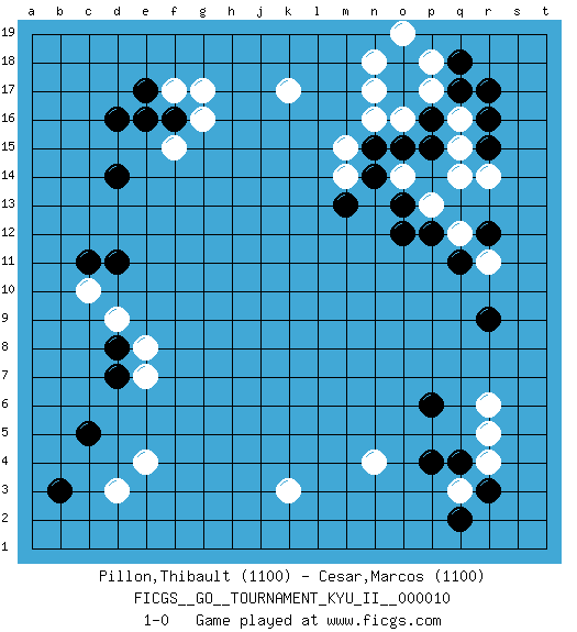 Last move : 1-0 2009 September 17 10:20:6 [Event "FICGS__GO__TOURNAMENT_KYU_II__000010"] [Site "FICGS"] [Date "2009.07.13"] [Round "1"] [Black "Pillon,Thibault"] [White "Cesar,Marcos"] [Result "1-0"] [Rating 1 "1100"] [Rating 2 "1100"] 1.q17 d3 2.d16 r4 3.r12 k17 4.c5 e4 5.d7 f17 6.f16 g16 7.e17 f15 8.e16 g17 9.d14 q15 10.r15 r14 11.r16 q14 12.r9 p17 13.p16 q16 14.o17 p18 15.r17 o16 16.p15 n17 17.o15 n16 18.n15 m15 19.o13 q12 20.o18 n18 21.q18 p13 22.q11 o14 23.n14 o19 24.o12 r11 25.p12 m14 26.m13 k3 27.p4 n4 28.p6 r6 29.r3 q3 30.q4 r5 31.q2 d9 32.c11 c10 33.d11 e7 34.d8 e8 35.b3 1-0 This go game has been lost on time (started : 2009.07.13 3:17:52) Here are the names of the openings (joseki) played in the four corners : Corner d4 : d3 c5 Komoku (Somok, Xiao~mu`) 3-4 Point. The komoku (3-4) point is the traditional corner enclosure move.. Ikken Kakari (Hankan Keolch'im, Yi Gua`jiao~, 1-Space Low Pincer). The small knight move is the basic approach move to the 3-4 point stone. It has been continually used for over four centuries. There are limitless variations, with new moves constantly being discovered. Black 2 opens the door to a treaure store of joseki. Corner d16 : d16 f17 Hoshi (Hwajeom, Seongjeom, Xingwei`) 4-4 Point. The star or hoshi (4-4) point, emphasizing influence at the potential expense of territory. Ikken Kakari (Hankan Keolch'im, Yi Gua`jiao~, 1-Space Low Approach). White 2 is the standard approach move to the 4-4. Corner q4 : r4 r9 Komoku (Somok, Xiao~mu`) 3-4 Point. The komoku (3-4) point is the traditional corner enclosure move.. Player Black won this Go (weiqi, baduk) game. Follow this game move after move (download)When your opponent has two weak groups, attack them both at once. (Anonymous) Who needs drugs and alcohol if he can play Big Chess at FICGS ? (Heinz-Georg Lehnhoff)