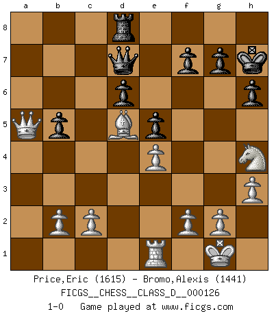 Last move : 1-0 2009 August 2 13:49:10 [Event "FICGS__CHESS__CLASS_D__000126"] [Site "FICGS"] [Date "2009.07.13"] [Round "1"] [White "Price,Eric"] [Black "Bromo,Alexis"] [Result "1-0"] [WhiteElo "1615"] [BlackElo "1441"] 1.e4 c5 2.Nf3 Nc6 3.d4 cxd4 4.Nxd4 e5 5.Nf3 Nf6 6.Nc3 Bb4 7.Bc4 h6 8.O-O O-O 9.Re1 d6 10.Bd2 Bg4 11.a3 Ba5 12.h3 Bh5 13.Nb5 Qe7 14.Bxa5 Nxa5 15.Ba2 Rfd8 16.Qd2 b6 17.Nh4 Bg6 18.Nxg6 Qd7 19.a4 Kh7 20.Nh4 a6 21.Nc3 b5 22.axb5 axb5 23.Nd5 Nxd5 24.Bxd5 Ra7 25.Rxa5 Rxa5 26.Qxa5 1-0 Sicilian : Labourdonnais-Loewenthal variation Kingside Castling by player White (move 8) Kingside Castling by player Black (move 8) Player White won this chess game. Follow this game move after move (download)I thought the most common mistake [in chess] was the first one: Learning the game :P (Garvin Gray, FICGS forum) Schach ist ein Teil der Kultur, und wenn es mit der Kultur abwärts geht, geht es auch mit dem Schach abwärts. (Mikhail Moiseyevich Botvinik) Dejen al perfeccionista jugar por correo. (Yasser Seirawan) On entre au jeu d'Echecs comme on entre en Religion. Pour le joueur d'Echecs, la partie d'Echecs c'est l'office, la messe, le défilé du 1er Mai, le dépôt de gerbe au Monument aux Morts. C'est un drame sacré. (Michel Roos) Optimism is a variety of information deficit. Sometimes especially true for correspondence chess games. (Michael Aigner)