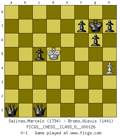Last move : 0-1 2010 January 22 8:22:16 [Event "FICGS__CHESS__CLASS_D__000126"] [Site "FICGS"] [Date "2009.07.13"] [Round "1"] [White "Salinas,Marcelo"] [Black "Bromo,Alexis"] [Result "0-1"] [WhiteElo "1734"] [BlackElo "1441"] 1.e3 d5 2.Nf3 e6 3.Ne5 Nf6 4.Bb5 c6 5.Be2 Bd6 6.d4 O-O 7.c4 Nbd7 8.c5 Bxe5 9.dxe5 Nxe5 10.Qd4 Qc7 11.Nd2 b6 12.Nf3 Nxf3+ 13.gxf3 bxc5 14.Qh4 c4 15.Rg1 Qe7 16.e4 dxe4 17.Bh6 g6 18.fxe4 e5 19.a3 Rd8 20.Rd1 Rxd1+ 21.Bxd1 Bb7 22.Bg5 Kg7 23.f4 exf4 24.Bc2 c5 25.Qxf4 Bxe4 26.Bxf6 Qxf6 27.Bxe4 Qxf4 28.Bxa8 Qc1+ 29.Kf2 Qxb2+ 30.Kg3 Qxa3+ 31.Kf2 c3 32.Ke2 Qb2+ 33.Kd3 Qd2+ 34.Ke4 Qd4+ 35.Kf3 Qxg1 36.Be4 Qd1+ 37.Kg2 c2 38.Bf3 Qxf3+ 39.Kxf3 c1Q 40.Ke4 a5 41.Kd5 a4 42.Kc6 a3 43.h4 a2 44.Kd5 a1Q 0-1 This chess game has been lost on time (started : 2009.07.13 7:13:38) Van't Kruijs Opening Kingside Castling by player Black (move 6) 10 pieces endgame at move 38 : White KP , Black KQPPPPPP WHITE : King + 1 Pawn BLACK : King + 1 Queen 6 Pawns 9 pieces endgame at move 39 : White KP , Black KPPPPPP WHITE : King + 1 Pawn BLACK : King + 6 Pawns Promotion Queen by player Black (move 39) Promotion Queen by player Black (move 44) Player Black won this chess game. Follow this game move after move (download)What is the difference between chess and football? Everybody understands football, but nobody plays it. Everybody plays chess, but nobody understands it. Everything is relative. (Vladimir Kramnik) Weshalb minderdergeübte Spieler mit g2-g4 beginnen? Die betreffenden sind unschlüssig, ob sie nun rechts (h4) oder links (f4) beginnen sollen, und in ihrer Ratlosigkeit entschliessen sie sich nach guter Bürgerart dazu, den goldenen Mittelweg zu wählen. (Aaron Nimzowitsch) Peones: ellos son el alma de esta partida, solos forman el ataque y la defensa. (Philidor) Aidez vos pièces, elles vous aideront. (Paul Morphy) Even the best needles are not sharp at both ends. (Chinese proverb)