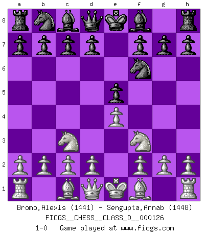 Last move : 1-0 2009 August 24 21:23:12 [Event "FICGS__CHESS__CLASS_D__000126"] [Site "FICGS"] [Date "2009.07.13"] [Round "1"] [White "Bromo,Alexis"] [Black "Sengupta,Arnab"] [Result "1-0"] [WhiteElo "1441"] [BlackElo "1448"] 1.e4 e5 2.Nf3 Nf6 3.Nc3 1-0 This chess game has been lost on time (started : 2009.07.13 7:13:38) Petrov Three knights game Player White won this chess game. Follow this game move after move (download)Life is like a game of Chess, changing with each move. (Chinese proverb) Ich liebe den Moment, wenn ich das Ego meines Gegenüber breche. (Robert James Fischer) El Ajedrez es de 30 a 40 por ciento psicología. Uno no cuenta con esto cuando se juega contra una computadora. No lo puedo confundir. (Judith Polgar) Que feriez-vous si vous étiez en train de jouer aux échecs et que la fin du monde arrive ? Je continuerais à jouer. (Saint Borromée) The obstacle is the path. (Zen proverb)
