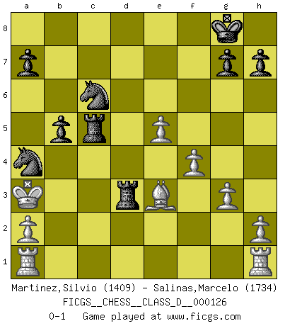 Last move : 0-1 2009 September 18 0:56:52 [Event "FICGS__CHESS__CLASS_D__000126"] [Site "FICGS"] [Date "2009.07.13"] [Round "1"] [White "Martinez,Silvio"] [Black "Salinas,Marcelo"] [Result "0-1"] [WhiteElo "1409"] [BlackElo "1734"] 1.e4 e6 2.d4 Qh4 3.Qf3 Nc6 4.g3 Qe7 5.Ne2 Nb4 6.Na3 d5 7.e5 f6 8.Bd2 fxe5 9.dxe5 Qc5 10.Qc3 d4 11.Qxc5 Bxc5 12.c3 Nd3 13.Kd1 Nxb2+ 14.Kc2 Na4 15.cxd4 Bxa3 16.Bh3 Be7 17.Nf4 c5 18.dxc5 Bxc5 19.f3 Ne7 20.Bxe6 Bxe6 21.Nxe6 Rc8 22.Nxc5 Rxc5 23.Kb3 b5 24.f4 O-O 25.Kb4 Nc6 26.Ka3 Rd8 27.Be3 Rd3 0-1 French defense Kingside Castling by player Black (move 24) Player Black won this chess game. Follow this game move after move (download)Chess is a terrible game. If you have no center, your opponent has a freer position. If you do have a center, then you really have something to worry about ! (Siegbert Tarrasch) Modernes Schach erfordert enorme Anspannung. Es ist für einen normalen Menschen unmöglich das auszuhalten. (Viktor Kortschnoi) El Ajedrez es la vida. (Bobby Fischer) Des points faibles ou des trous dans la position de l'adversaire doivent être occupés par des pièces et non pas par des pions. (Siegbert Tarrasch) Memory is a crazy woman that hoards colored rags and throws away food. (Austin O'Malley)