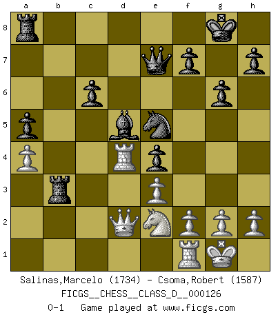 Last move : 0-1 2010 February 1 8:43:22 [Event "FICGS__CHESS__CLASS_D__000126"] [Site "FICGS"] [Date "2009.07.13"] [Round "1"] [White "Salinas,Marcelo"] [Black "Csoma,Robert"] [Result "0-1"] [WhiteElo "1734"] [BlackElo "1587"] 1.e3 e5 2.Qh5 d6 3.Nc3 Nf6 4.Qh4 Be7 5.Bb5 c6 6.Ba4 O-O 7.Ne4 d5 8.Nxf6 Bxf6 9.Qh5 g6 10.Qf3 e4 11.Qe2 b5 12.Bb3 a5 13.a4 b4 14.d3 Ba6 15.c4 bxc3 16.Bc4 cxb2 17.Bxb2 dxc4 18.dxc4 Bxb2 19.Qxb2 Bxc4 20.Rd1 Qe7 21.Rd4 Bd5 22.Ne2 Nd7 23.O-O Rfb8 24.Qc3 Rb3 25.Qd2 Ne5 0-1 This chess game has been lost on time (started : 2009.07.13 7:13:38) Van't Kruijs Opening Kingside Castling by player Black (move 6) Kingside Castling by player White (move 23) Player Black won this chess game. Follow this game move after move (download)A thorough understanding of the typical mating continuations makes the most complicated sacrificial combinations leading up to them not only not difficult, but almost a matter of course. (Siegbert Tarrasch) Ein Großmeister muß tausende Partien in seinem Kopf speichern, denn diese sind für Ihn, was die Worte der Muttersprache für gewöhnliche Leute sind, oder Noten für Musiker... (Garry Kasparov) Las combinaciones han sido siempre el aspecto más intrigante del Ajedrez. Los Maestros las buscan, el público las aplauden, los críticos las alaban. La razón se debe a que las combinaciones hacen posible que el Ajedrez sea más que un ejercicio matemático con una carencia de vida. Ellas son la poesía del juego, son del Ajedrez lo que la melodía es de la música. Ellas representan el triunfo de la mente sobre la materia. (Reuben Fine) Seul un grand joueur sait à quel point il joue faiblement. (Xavier Tartacover) A specialist learns more and more about less and less until he knows everything about nothing. (Nicholas Murray Butler)