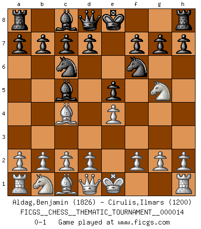 Last move : 0-1 2006 November 19 2:5:8 [Event "FICGS__CHESS__THEMATIC_TOURNAMENT__000014"] [Site "FICGS"] [Date "2006.09.20"] [Round "1"] [White "Aldag,Benjamin"] [Black "Cirulis,Ilmars"] [Result "0-1"] [WhiteElo "1826"] [BlackElo "1200"] 1.e4 e5 2.Nf3 Nc6 3.Bc4 Nf6 4.Ng5 Bc5 0-1 Two knights defense : Wilkes Barre (Traxler) variation Player Black won this chess game. Follow this game move after move (download)All my games are real. (Bobby Fischer) Wenn ich Weiß habe gewinne ich weil ich Weiß habe, wenn ich Schwarz habe gewinne ich weil ich Bogoljubov bin. (Efim Bogoljubov) Fischer es el jugador mas fuerte del mundo. De hecho, el jugador mas fuerte que jamas haya existido. (Larry Evans) J'ai toujours senti une vague pitié pour l'homme qui ne connaît rien aux échecs, tout comme j'en aurais pour un homme ignorant de l'amour. Les Echecs, comme la musique ou comme l'amour, ont le pouvoir de rendre heureux. (Siegbert Tarrasch) Memory is a crazy woman that hoards colored rags and throws away food. (Austin O'Malley)